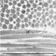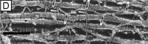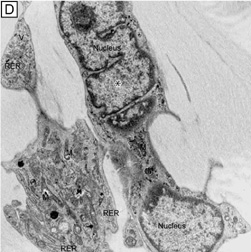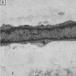 The corneal stroma is maintained by a closed, highly-organized syncytium of keratocytes communicating with each other through gap junctions present on their long dendritic processes.68 Keratocytes occupy 10% to 40% of the stromal volume (decreases from 40% in infancy to 10% in adulthood) that on two-dimensional, cross-sectional views appear as flattened (cell body = 20 μm in length × 1 μm in height), quiescent (i.e., scant intracytoplasmic organelles) cells lying between corneal lamella (Fig. 16A, B). In actuality, keratocytes are three-dimensional, stellate-shaped cells composed of a cell body (≅1 × 15 × 20 μm) with numerous dendritic-processes that extend up to 50 μm in length from the cell body. Two-dimensional tangential sections of the normal cornea suggest that these cells are more highly metabolically active in the resting state than initially presumed; in tangential sections (cell body view = 15 μm width × 20 μm), an abundance of cytoplasmic organelles is commonly seen (Fig. 16C, D).69