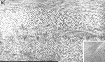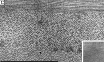 EMBRYOLOGY AND DEVELOPMENT The sclera is predominantly neural crest-derived, except for a small temporal portion that comes from the mesoderm.255 The development of the sclera begins during the seventh week of gestation as the anterior periocular mesenchyme, which is derived from neural crest cells, condenses anteriorly on the optic cup. It subsequently differentiates into an inner vascular layer forming the uvea (iris, ciliary body, choroid) and an outer fibrous layer forming the sclera. By the third month of gestation, a well-formed sclera completely envelopes the eye. It gradually increases in thickness and denseness during the remaining months of gestation. At birth, the sclera is relatively thin, highly distensible, and translucent. This latter feature explains why the blue color from the underlying uvea oftentimes shows through the infant sclera. During the first 3 years of life, it grows in size, remains thin, and remains relatively-translucent, but gradually loses its high distensibility. This latter fact explains why the sclera can expand from increased intraocular pressure resulting in a buphthalmic eye (“ox eye”) only from birth to around the age of 3 years old. Thereafter, the sclera distends only slightly from increased intraocular pressure with the notable exception being that of highly myopic eyes. After age 3, in addition to gradually thickening and becoming more opaque, it continues to grow throughout childhood, reaching adult size at 14 to 18 years of age. Thereafter, the sclera continues to become even less distensible and more rigid with advancing age. GROSS ANATOMY The sclera is an incomplete sphere that surrounds the posterior five-sixths of the globe.255 It has a total outer surface area of 16.3 to 17 cm2 and an outer diameter of 24 mm.255 It is thickest posteriorly near the optic nerve (1.0 mm), decreasing gradually as it approaches the equator of the globe (0.4 mm) before becoming thinnest typically near the rectus muscle insertion sites (0.3 mm).256 It then gradually increases in thickness up to the limbus (0.8 mm) (Fig. 33C).256 There are two major openings in the sclera: the anterior scleral foramen (13.7 mm diameter; circumscribes the area of the cornea and limbus) and the posterior-nasally located, fenestrated posterior scleral foramen, or scleral canal (2.0- to 3.0- mm diameter; circumscribes the area of the optic nerve). The scleral canal is very important clinically because the inner third of sclera forms a fenestrated scaffold in this canal termed the lamina cribosa that supports the optic nerve axons. Because the lamina cribosa is the weakest point of globe to expansile forces, diseases that cause high intraocular pressure, like glaucoma, preferentially cause lamina cribosa ectasia and damage to the optic nerve fibers. There are also numerous minor openings in the sclera, including the 30 to 40 emissary channels (ciliary arteries, veins, or nerves) and the 4 to 7 vortex vein channels. The outer surface of the sclera is smooth, except where the tendons of the extraocular muscles insert (spiral of Tillaux and oblique muscle insertion sites) and where Tenon's capsule adheres (within 1 mm of limbus, over rectus muscle insertion sites, and around the optic nerve). The superficial layer of the sclera, called the episclera, is a thin, highly-vascularized, dense connective tissue. It is around 15- to 20-μm thick near the limbus, progressively thinning as it extends into the posterior aspect of the eye. The scleral stroma proper is a white, relatively avascular, dense connective tissue accounting for ≥95% of total scleral thickness. Finally, the inner surface of the sclera is a brown, avascular, very thin (5 μm) layer called the lamina fusca. MICROSCOPIC ANATOMY, ULTRASTRUCTURE, AND PHYSIOLOGY OF THE SCLERA The sclera is predominantly composed of water (68% hydrated) that is stabilized in a severely disorganized structural network of insoluble and soluble extracellular proteins with few fibrocytes.252 The dry weight of the adult human sclera is due to collagen (75%), proteoglycans (2%), fibrocyte constituents (2%), elastin (2%), blood vessels constituents, and salts, glycoproteins, or other substances.253 The majority of the sclera consists of the scleral stroma proper, which is somewhat similar in structure and composition to the corneal stroma.255 Collagen is the major water insoluble extracellular protein of the scleral stroma proper (80% type I, 5% type III, and minor amounts of type V and VI collagen), whereas elastin is a minor component.252 In contrast to the cornea, the collagen fibrils (collagen type I, III, V) that make up the sclera are wider (averages 100 nm in diameter), more nonuniform in diameter (range 25 to 300 nm in diameter), more irregularly spaced, and are arranged in variously sized (0.5- to 6-μm thick by 10- to 50-μm wide), highly interweaving, irregularly-directed bundles (Fig. 34).253,255,257