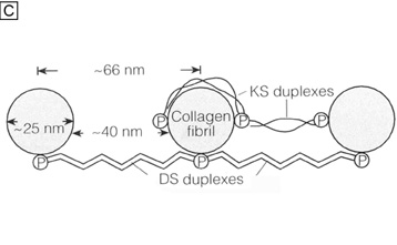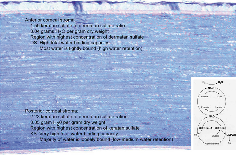 When the mammalian cornea is mounted in an Ussing chamber, it generates a transepithelial potential of 25 to 40 mV. This relatively high voltage is consistent with the low ionic conductance of the apical epithelial cell membranes and the high resistance of the tight junctions of the paracellular pathway, which normally is in the range of 12 to 16 kΩ cm2.6 Almost 50% of the short-circuit current across the corneal epithelium is carried by chloride ions moving through apical membrane channels into the tears. This current is due to ionic gradients set up by epithelial transport of Na+ and Cl− ions. Na+ ions are pumped from the epithelial cells toward the stroma by the Na+/K+ adenosine triphosphatase (ATPase) in the lateral membranes of the cells, which, as in other cells, maintains an inward Na+ gradient. A Na+-chloride co-transporter, also located in the lateral membrane, facilitates the influx of Na+ down its electrochemical gradient, carrying along chloride ions. The chloride ions then diffuse through channels in the apical membranes. This chloride secretion is blocked when the Na+/K+ ATPase is inhibited by ouabain, demonstrating the coupling of chloride secretion to Na+ transport.33–36 In addition to the transport mechanisms described, the corneal epithelial cells also contain a Na+/H+ exchanger and a lactate-H+ co-transporter. These transport mechanisms serve to regulate intracellular pH by extrusion of lactate and H+ ions.37 The above discussion raises questions concerning the overall role of these transport mechanisms and second-messenger systems in corneal epithelial function. It has been demonstrated in vitro that ion transport can osmotically move water from the stroma to tears6; however, in vivo epithelial ion transport probably has a limited role, if any, in corneal deturgescence as compared to the endothelium. Finally, it has been shown in both animal and human specimens that the corneal epithelium, although devoid of melanocytes, does contain immune cells. The basal epithelial cell layer of the peripheral cornea, along with the limbus and the conjunctiva, appears to have a subpopulation of cells intermixed that are bone-marrow–derived immune surveillance cells with high constitutive expression of major histocompatibility complex (MHC) type II antigen and co-stimulatory molecules.38 This type of immune cell has previously been termed a Langerhans cell,39 which functions as a “professional” antigen-presenting cell with an extraordinary capacity to initiate T-cell lymphocyte-dependent responses.40 The functional steps of this cell type include the uptake and processing of antigens, the migration out of the cornea to lymph nodes where they stimulate naïve T-lymphocyte immune responses by presenting antigens and overexpressing co-stimulatory molecules. Recently, the central corneal epithelium also was found to have a similar subpopulation of immune cells that are apparently “immature” Langerhans cell types because their constitutive expression of MHC type II antigen and costimulatory molecules is low.41 Interestingly, these “immature” Langerhans cells under certain circumstances (e.g., inflammation or trauma) may develop the requisite signals for T-cell priming.41 MICROSCOPIC ANATOMY, ULTRASTRUCTURE AND PHYSIOLOGY OF THE STROMA The corneal stroma accounts for 90% of the corneal thickness. It is predominantly composed of water (78% hydrated or 3.5 g H2O/g dry weight), which is stabilized by an organized structural network of insoluble and soluble cellular and extracellular proteins (Fig. 1).42 The dry weight of the adult human corneal stroma is made up of collagen (68%), keratocyte constituents (10%), proteoglycans (9%), and salts, glycoproteins, or other substances.43 Collagen is a water-insoluble structural protein organized into an inextensible scaffold that forms the basic structural framework of connective tissues. In the human cornea, stromal collagens are poorly-ordered in the Bowman's layer (i.e., the primary acellular stroma that is presumably ectodermally-derived), whereas they form a highly-ordered lattice-like structure in the secondary cellular stroma (neural crest-derived).44 Overall, the corneal collagens are functionally important in establishing tissue transparency and in resisting tensile forces because collagen fibrils and filaments hold the cornea together (i.e., cohesive strength), ultimately defining the size of the tissue. Keratocyte components make up the second major component of the cornea's dry weight. Interspersed between collagen lamellae throughout the secondary cellular stroma, keratocytes form a closed, highly-organized syncytium. Keratocytes are neural crest-derived cells that enter the cornea during the second mesenchymal wave of corneal embryologic development. They function as modified fibroblasts during neonatal life, forming the extracellular matrix of the secondary cellular stroma. Subsequently, they typically remain in the cellular stroma throughout life as modified fibrocytes where they maintain the extracellular matrix of the corneal stroma, usually in an inconspicuous, or relatively transparent, fashion. Proteoglycans, which are water-soluble glycoproteins, are the third major component of the cornea's dry weight. Each proteoglycan molecule consists of a protein core with a covalently attached anionic polysaccharide side chain called a glycosaminoglycan (GAG). The proteoglycans are three-dimensionally ordered in the corneal stroma because the protein core of the molecule is noncovalently attached to collagen fibrils evenly throughout the tissue, whereas the GAG sidechain extends into the interfibrillar space where it acts as a pressure-exerting polyelectrolyte gel.45–47 After Hedbys showed that the cornea collapses to around 20% of its volume if the proteoglycans in the tissue are precipitated with cetylpyridinium,48 it has become quite apparent that the primary function of proteoglycans is to provide tissue volume, ma