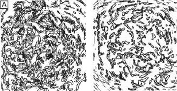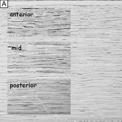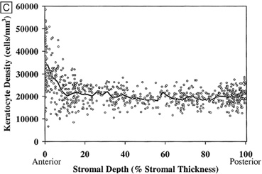 Tangential sections also have shown more clearly that the anterior stromal keratocytes contain twice the number of mitochondria than the posterior two-thirds of the stroma, which correlates with the oxygen tension levels in the cornea. It also has demonstrated that a higher density or volume of cells reside in the anterior stroma than in the mid or posterior stroma (Fig. 17). Moreover, these views make it easy to appreciate that, in all levels, the keratocytes are highly spatially-ordered as they turn in a clockwise direction like a corkscrew.