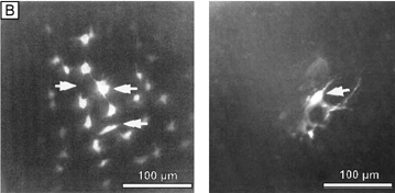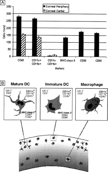 In vivo confocal microscopy of normal human corneas has shown keratocyte densities average around 20,000 keratocytes/mm3 (or an area of 328 cells/mm2). The focal zone of increased cell density directly under the epithelial surface averages 35,000 keratocytes/mm3 in the anterior-most 9-μm layer and gradually tapers to 20,000 keratocytes/mm3 over the initial 60 μm in depth (Fig. 17C).70 Confocal microscopy also concurs with previous studies as it shows that stromal cellular density decreases with age at approximately 0.45% per year of life. Interestingly, studies using immunohistochemistry on animal corneas71,72 and ultrastructural studies on human corneas69,72 suggest that not all the cells in the corneal stroma are keratocytes (i.e., fibrocytes), but some are one of three types of bone marrow-derived immune cells (“professional” dendritic cells, “nonprofessional” dendritic cells, and histiocytes) (Fig. 18). Thus, although the majority of cells in the stroma are keratocytes, which maintain the corneal stroma by synthesizing and secreting collagen type I, III, V, VI, XII, XIV, keratan sulfate, dermatan sulfate, and matrix metalloproteinases, a minority of cells in the stroma are also “professional” stromal dendritic cells, “nonprofessional” stromal dendritic cells, or stromal histiocytes. They appear to play a pivotal role in the induction of immune tolerance versus immune initiation into cell-mediated immune pathways. Additionally, the stromal histiocytes play a role in innate immunity as phagocytic effectors cells.
