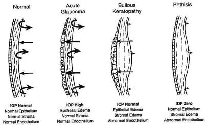 Two ion channels similar to those found in excitable cells have been characterized in keratocytes isolated from corneal stroma.73 These channels include a delayed rectifer K+ channel and a tetrodotoxin-sensitive Na+ channel. The physiologic function of these channels has not been determined, but they may function in maintaining the ionic balance of the cells in their inactive state. In addition, because these channels allow the keratocytes to elicit action potentials when injected with a clamping current, it is possible they may act as intercellular signalers via the gap junctions between cells. This could be a route for information exchange between cells in different regions of the cornea. Corneal Edema The Donnan effect states that the swelling pressure in a charged gel, like the corneal stroma, results from ionic imbalances. The fixed negative charges on corneal proteoglycan GAG sidechains (one carboxylic acid and one sulfate ester sidechain per disaccharide repeat on a dermatan sulfate GAG polymer, and one or two sulfate ester sidechains per disaccharide repeat on a keratin sulfate GAG polymer) have a central role in this effect as the antiparallel GAG duplexes (tertiary structure) produce long-range electrostatic repulsive forces that induce an expansive force termed swelling pressure (SP). Because the corneal stroma also has a cohesive tensile strength that resists this expansion, the normal SP of the nonedematous corneal stroma is around 55 mm Hg.74,75 If the stroma is further compressed (e.g., increasing intraocular pressure [IOP] or mechanical applanation) or expanded (e.g., corneal edema), the SP will correspondingly increase or decrease, respectively. Conversely, the negatively-charged GAG sidechains also form a twofold helix in aqueous solution (secondary structure) that attracts and binds Na+ counterions, which results in an osmotic effect leading to the diffusion and subsequent absorption of water to proteoglycans via the Na+ cations. Thus, the central corneal thickness is maintained around its average value of 520 μm because the fixed negatively-charged proteoglycans induce a swelling pressure through anionic repulsive forces. Additionally, the hydration level of corneal stroma is maintained around 78% water because these proteoglycans also imbibe water through cationic attractive forces.45 Under normal circumstances, the negative pressure drawing fluid into the cornea, called the imbibition pressure (IP) of the corneal stroma, is around −40 mm Hg.76 This implies that the negative charges on corneal proteoglycans are only about one-quarter (≅27 %) saturated, or bound, with water with the remaining unbound proportion wanting to bind more Na+ and absorb more water if given the opportunity. Fortunately, the highly impermeable epithelium and mildly impermeable endothelium keep the diffusion of electrolytes and fluid flow in the stroma to such a low level [resistance to diffusion of electrolytes and fluid flow = epithelium (2000) >> endothelium (10) > stroma (1)] that the continuously working endothelial cell metabolic pump can maintain stromal hydration in the normal range. Although IP = SP when corneas are in the ex vivo state, IP actually is lower than SP in the in vivo state because the hydrostatic pressure induced by the IOP must now be accounted for. This is best represented by the equation IP = IOP − SP76 and explains why the hydration level of patient's cornea is not only dependent on having normal barrier functions, but also on having a normal IOP. Therefore, a loss of corneal barrier function, an IOP ≥55 mm Hg, or a combination of the two results in corneal edema (Fig. 19).77