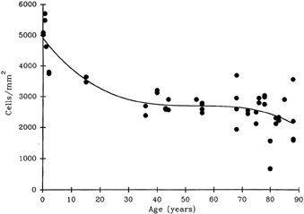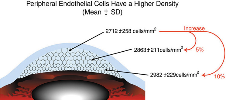 It is important when reviewing this information to realize that these are average central corneal endothelial cell measurements from predominantly Caucasian U.S. populations, as racial and geographic differences can exist. Also, understand that this data applies only to central corneal endothelial measurements because recent work has shown that higher cell densities can typically be found in more peripheral aspects of the cornea (Fig. 21).87 Therefore, based on these studies, it appears that central corneal endothelial cell numbers decrease on average about 50% from birth to death in normal subjects. Because corneal decompensation typically does not occur until central values reach around 500 cells/mm2, there appears to be plenty of cellular reserve potential remaining after an average human life span.86 Estimates suggest that healthy, normal human corneal endothelium could maintain corneal clarity up to a minimum of 215 years of life, if humans lived that long.85