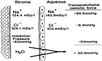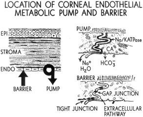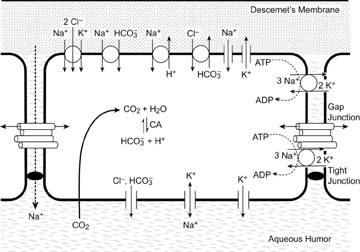 The primary function of the corneal endothelium is to maintain the health, deturgescence, and clarity of the cornea through a pump-leak mechanism first described by David Maurice (Fig. 22).88 Secondarily, it is also known to secrete an anteriorly-located basement membrane called Descemet's membrane and a posteriorly-located glycocalyx.58