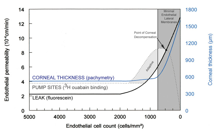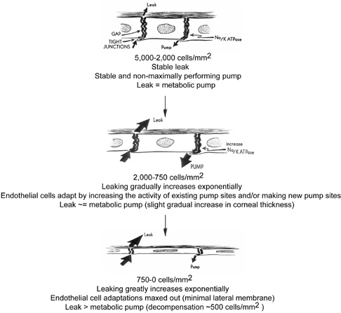 The first evidence to suggest that corneal endothelial cells have metabolic pumps was the observation that stromal edema (i.e., corneal clarity) is temperature-dependent.91 Lowering the temperature arrested the endothelial metabolic pump causing corneal stromal edema, whereas restoring it back to physiologic levels resolved the edema. Subsequently, it was determined that the lateral plasma membrane of endothelial cells contains ATP-dependent transport proteins that catalyze the movements of ions from the stroma to the aqueous humor, creating an osmotic gradient that draws water from the stroma.92 It is important to note that this osmotic gradient occurs only if the endothelial cell barrier is not breached. The primary transport proteins creating this effect were later determined as Na+/K+-ATPases (Fig. 22).93,94 Subsequently, the number and density of Na+/K+-ATPases sites has also been quantified using [3H]-ouabain, which calculated that approximately 3 million Na+/K+-ATPases sites are present around the lateral membrane of a single endothelial cell (average density of pump sites along lateral plasma membrane wall = 4.4 trillion sites/mm2).95 Recent studies have inferred that only by 5 to 7 months of gestation does the density of Na+/K+-ATPases increase to adult levels so that the cornea becomes dehydrated and transparent.96 Clinically, the metabolic pump of the corneal endothelium can be assessed in vivo by measuring the how quickly the corneal thickness (pachymetry) recovers after being purposefully swollen by wearing oxygen-impermeable contact lens. A number of factors are known to alter endothelial pump function: pharmacologic inhibition of Na/K-ATPase (e.g., ouabain), decreased temperature, lack of bicarbonate or carbonic anhydrase inhibitors, and chronic reduction in endothelial cell numbers from mechanical injury, chemical injury, or disease states. Fortunately, physiologic compensatory mechanisms prevent corneal edema from occurring to a certain degree (central endothelial cell densities between 2,000 to 750 cells/mm3) by increasing the activity of pump sites already present (requiring more ATP production by the cell) and/or by increasing the total number and density of pump sites on the lateral membranes of endothelial cells (Figs. 26 and 27).95 A similar phenomenon occurs in the cells of the kidney's proximal tubule to adjust for an increased salt load. For example, with Fuchs' endothelial dystrophy, the cornea has been known to remain clear and of normal thickness, despite having very low endothelial cell counts and increased endothelial flourescein permeability (2.89 × 10−3 to 5.30 × 10−3mm/min).95 Apparently, this occurs because the density of the Na+/K+ pump sites increases (mean of 10.2 × 109 sites/mm2) to compensate for increased permeability.97 The point at which compensatory mechanisms appear to ultimately fail is when central endothelial cell density reaches levels around 500 cells/mm3 (range of 250 to 750 cells/mm3) (Figs. 26 and 27).85,98 At this low cell number, the permeability has greatly increased to such a point that the endothelial cells, which are spread so thin, do not have enough room on their lateral cell membranes for more metabolic pump sites and all the current pumps are maximally active. Therefore, the metabolic pump fails to balance the leak and corneal edema results.