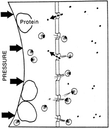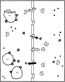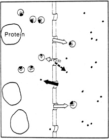 proteins. If a solution of protein and salt is separated from either water or a less concentrated salt solution by a membrane permeable to the salt and water but not to the protein, then there will be a net movement of water to the protein side by diffusion, and a movement of salt away from the protein side. The protein, of course, cannot move across the membrane. This process is called dialysis (Fig. 5) and is utilized, for example, for removing unwanted salts and other toxic substances from the blood, using the peritoneum as the membrane (peritoneal dialysis), or by using a synthetic membrane such as that found in a dialysis machine (artificial kidney). By the addition of a hydrostatic pressure on the protein side of the system, the exchange of salt and water can be accelerated. This process is called ultrafiltration and differs from dialysis only because the hydrostatic pressure changes the rate of movement of ions and slightly changes their final respective concentrations. The fluid formed by the process of dialysis is called a dialysate, and that formed by ultrafiltration is called an ultrafiltrate. Ultrafiltration is the process that occurs across capillary walls due to the higher pressure and higher protein concentration in the plasma as compared with the extracellular space (Fig. 6). |