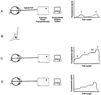 It is possible to inject a substance such as PAH or fluorescein into the bloodstream and maintain a high concentration there. Over a period of several hours, a small but measurable amount diffuses into the aqueous humor and reaches an equilibrated concentration. The injection is then stopped, and the level of the fluorescein or PAH in the blood subsequently declines rapidly, owing to renal clearance. The concentration of the substance in the aqueous, however, remains relatively constant over a short period of time, after which it starts to decrease, as fresh aqueous is formed not incorporating any PAH or fluorescein, because of low plasma levels. The rate of fresh aqueous formation can be calculated by measuring the declining concentration either by sampling the aqueous first in one eye, then later in the second eye, as in the case of PAH, or by optical means using fluorophotometry, as in the case of fluorescein (Fig. 10). Bárány and Kinsey250 developed this technique for PAH, and it was extended for use with fluorescein.248,251–253 The technique using fluorescein has been modified by dropping the fluorescein topically onto the eye rather than by injecting it.254,255 The dye in this case gains access to the anterior chamber via corneal absorption. There are, however, inherent problems with this approach, specifically, the problem of measurement of fluorescence in the anterior chamber and cornea, and the deduction of aqueous flow from the change in fluorescence over time.3 The first problem was solved by the construction of a slit-lamp fluorometer.256,257 The second was addressed by a number of investigators who devised several new experimental approaches.55,250,258 Thus, despite the drawbacks of fluorophotometry using topically applied fluorescein, the technique has become the gold standard in studies involving the human eye. Jones and Maurice248 realized that the corneal stroma could serve as a depot from which fluorescein could be introduced slowly into the anterior chamber. This method clarified the important role of the cornea in affecting the kinetics of topically applied drugs and tracers. Maurice's technique is now used most frequently for the measurement of the rate of aqueous formation in the human eye. The method involves the application of fluorescein topically to the eye, which subsequently penetrates the corneal epithelium and enters the stroma. Fluorescein is not metabolized by the eye and thus can disappear in only three ways: (i) rediffusion through the corneal epithelium and loss with the tears, (ii) lateral diffusion into the limbal tissue, or (iii) penetration of the endothelium and entrance into the aqueous humor, from where it is washed away by flowing aqueous, or is lost by diffusion into the iris (approximately 10% of fluorescein in the aqueous is lost by this route in the human eye).259 The third pathway of movement of fluorescein from the corneal stroma offers the least resistance, and thus is the major pathway of loss of fluorescein from the stroma. The advantages of Maurice's technique are that it is safe, repeatable, and objective. Studies of the human eye can span 18 to 24 hours after application of a single dose of fluorescein. The procedure disturbs the eye minimally, and the subject need not be constrained during the interval of measurement. Furthermore, the technique is reliable even when the rate of flow is not constant.3 In one variation of this technique, fluorescein is introduced into the stroma simply by applying drops topically to the inferior fornix of the conjunctiva.254,260 A waiting period of 6 hours or more allows the dye to become more uniformly distributed within the stroma. In another variation, fluorescein is applied by iontophoresis.248 This procedure involves the introduction of fluorescein into the anterior chamber by forcing it through the cornea via the application of a small electric current. Fluorescence is measured in the stroma and in the anterior chamber at the beginning and end of an interval. Flow is the clearance of the dye during the interval minus the diffusional loss. The technique, however, is not applicable to eyes that lack an iridolenticular barrier between the anterior and posterior chambers. Furthermore, the technique measures only that portion of secreted aqueous that passes into the anterior chamber.3 McLaren261 developed a technique of measurement of aqueous flow based on flare. Flare (pathologic scattering of light resulting from the presence of protein in the aqueous resulting from inflammation and breakdown of the blood–aqueous barrier) was induced by argon laser photocoagulation of the iris in rabbits, and a scanning ocular spectrofluorophotometer was used to measure scattering in the anterior chamber. This method was used to study changes in aqueous flow over the diurnal cycle. A technique for the measurement of aqueous flow using corneal and vitreous depots of fluorescein in the rabbit eye has also been described.262,263 It may be concluded that (i) movement of water into or out of the vitreous can cause large changes in the rate of movement of dye from the vitreous to the anterior chamber and can make interpretation of the vitreous method ambiguous and (ii) the vitreous method is probably superior for measuring sustained changes of the rate of aqueous flow over at least 10 hours, or perhaps several days, but it cannot be reliably used for measuring changes over shorter periods. Similar types of studies have been performed using iodide.264 In all cases, it is assumed that the amount of substance leaving the eye by alternative routes is negligible compared with the dilution by fresh aqueous. By using the method of Maurice and introducing fluorescein by iontophoresis, a value of 2.48 ± 0.17 μL/min (mean ± standard error of the mean [SEM]) was calculated for aqueous flow in the human eye.248 Holm245 carried this method one step further. After forcing fluorescein into the anterior chamber, the fluorescein