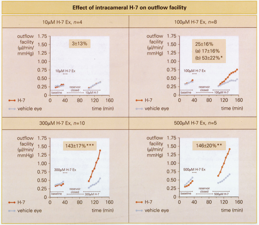 Other agents that are known to affect trabecular outflow facility include α-chymotrypsin,623 ergotamine, angiotensin,641 chondroitinase ABC,642 and testicular643,644 or Streptomyces645 hyaluronidase. Pharmacologic trabeculocanulotomy utilizing agents such as the ones discussed (cytochalasins, chelators, ethacrynic acid, α-chymotrypsin, chondroitinase ABC, hyaluronic acid, H-7, and latruncluin A/B) has been proposed as a possible strategy for the treatment of glaucoma since the 1970s.646 The sequence of events by which these agents decrease outflow resistance is being clarified as described for H-7 and latrunculin A/B above. Another approach to increase aqueous humor outflow is to inhibit or enhance the molecular pathways involved in regulating trabecular cell contractility by using gene therapy647–650 or to block cellular interactions with the extracellular environment that enhance actomyosin contractility and the formation of actin stress fibers.651 Long-term expression of genes that alter aqueous outflow has not yet been possible in the nonhuman primate eye. Certain glucocorticoids administered topically or systemically to humans cause an elevation of IOP.337,652–654 Ocular hypertension can be induced in rabbits via the chronic systemic administration of glucocorticoids.655–657 The ability of glucocorticoids to alter IOP has been ascribed to their effect on the trabecular meshwork and aqueous humor outflow.658 Glucocorticoid receptors have been identified in the cells of the outflow pathways,659–661 but the biochemical and consequent physical processes causing the decrease in facility are poorly understood. Studies suggest that glucocorticoids may play a major role in the normal physiologic regulation of outflow facility and IOP, perhaps by modulation of macromolecular metabolism or prostaglandin/adrenergic interactions involving the outflow system. As mentioned earlier (aqueous secretion section), the aqueous humor of control and POAG patients has levels of cortisol in excess of what is in the general circulation as a result of the activity of 11β-hydroxysteroid dehydrogenase 1 in the ciliary epithelium where it is involved in regulating aqueous secretion.213,214 The cortisol levels could also reduce aqueous outflow facility to a level that is detrimental in susceptible individuals.218 In the normal population, 34% to 42% of patients treated with topical or systemic corticosteroids are termed steroid responders, and develop markedly elevated IOP after several weeks.653,662 A similar percentage of nonhuman primates also develop ocular hypertension after topical dexamethasone treatment.663 This contrasts to patients with POAG, 90% of whom are considered steroid responders.653,662,664 The oral administration of the glucocorticoid biosynthesis inhibitor metyrapone to patients with glaucoma665 or the 11β-hydroxysteroid dehydrogenase inhibitor carbenoxolone to ocular hyperpertensive patients214 elicit small, transient reductions in IOP. A generalized cellular hypersensitivity to glucocorticoids is not intrinsic to POAG.666 Patients with glaucoma have increased plasma levels of cortisol compared to normal individuals.667,668 The glucocorticoid effect on the physiology of the outflow pathways may be more rapid than previously believed—certainly less than the 3 to 6 weeks classically described after topical eye drops.669 In cultured trabecular meshwork cells obtained from patients with POAG, cortisol metabolism is altered. These cells accumulate 5β-dihydrocortisol and, to a lesser extent, 5α-dihydrocortisol, metabolites that are not found to be present in cells derived from normal individuals. This difference is due to a marked increase in Δ4-reductase activity and to a decrease in 3-oxidoreductase activity not found in all cortisol-metabolizing cells.670,671 Southren672 demonstrated that topically applied 3α, 5β-tetrahydrocortisol (3α, 5β-THF), an intermediate metabolite of cortisol, decreases IOP and increases outflow facility in glaucomatous human eyes, and that 3β, 5β-THF antagonizes dexamethasone-induced cytoskeletal reorganization in normal human cultured trabecular meshwork cells.672,673 Interestingly, cultured trabecular meshwork cells from patients with POAG metabolized cortisol predominantly to 5β-dihydrocortisol (5β-DHF), which potentiates the facility-decreasing and IOP-increasing effects of dexamethasone; these cells produce relatively little 3α, 5β-THF from cortisol.672 Possible mechanisms for steroid-induced elevation of IOP have been proposed and include: accumulation or deposition of extracellular matrix material,674–679 decreased protease and stromelysin activities,680,681 reorganization of the trabecular meshwork cytoskeleton,682,683 increased nuclear size and DNA content,684 decreased phagocytic capacity,685 and changes in the synthesis of specific proteins.686 The progressive induction of one major steroid product in human trabecular meshwork cells matches the time course of clinical steroid effects on IOP and outflow facility. This molecule, known as TIGR or myocilin (MYOC), appears to be a secreted glycoprotein with aggregation- and extracellular matrix–binding groups687,688 interacting with extracellular components such as fibronectin.544,689,690 MYOC has also been localized intracellularly in the trabecular meshwork.689,691,692 Initially MYOC has been linked directly to both juvenile- and adult-onset open-angle glaucoma.693,694 MYOC mRNA and protein are present in a variety of ocular and nonocular tissues.695 Mutations in TIGR/MYOC, however, are not implicated in causing or increasing susceptibility to steroid-induced glaucoma.663 It has been suggested that MYOC is a stress protein.696,697 MYOC has an antiadhesive effect on trabecular meshwork cells in culture resulting in a loss of actin stress fibers and focal adhesions. Counter migratory effects on trabecular meshwork cells are also observed.698 These properties could enhance cell loss