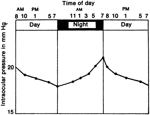 The intraocular pressure is a dynamic function like heart rate and blood pressure and is influenced by many factors. A single measurement of intraocular pressure does not necessarily reflect the average pressure in that hour, day, or week. DIURNAL VARIATION Intraocular pressure in humans follows a diurnal rhythm.4,8 Most commonly, the pressure is highest in the early morning (around 7 AM), and lowest in the evening (around 5 PM; Fig. 2) but considerable individual variation exists regarding the time of day or night when the peak and nadir occur.10–12 The intraocular pressure usually varies less than 5 mmHg from peak to nadir, although differences as large as 15 mmHg have been found. Some people with elevated intraocular pressure are found to have large diurnal peaks and troughs13 and can show variations of as much as 8 mmHg from hour to hour.14 Irregular sleep patterns alter the usual diurnal pattern of intraocular pressure.15 The diurnal pattern of intraocular pressure has been correlated with circadian rhythms of other functions, such as blood pressure, body temperature, and adrenal corticosteroid secretion. In many subjects, the intraocular pressure rises several hours after an increase in plasma adrenal corticosteroids.16,17 This pattern may be due to changes in both aqueous secretion and outflow resistance.18,19 The existence of diurnal variation implies that a single random intraocular pressure measurement does not adequately represent average pressure over a 24-hour period. Peak intraocular pressure can only be obtained by around the clock measurements or with measurements taken at different times of the day. In glaucoma patients, normal intraocular pressures recorded during office hours can give a false clinical impression of adequate pressure control.20–22 Phelps and colleagues argued that a single office pressure measurement was likely, though not certain, to be representative of the peak diurnal pressure.23 Zeimer, however, using Phelps and coworkers' data, calculated that the 95% confidence interval for such a prediction was ±6.6 mmHg, an uncertainty of more than 13 mmHg.12 A small (about 1.5 mmHg) seasonal variation in intraocular pressure has been described, with the highest pressures recorded in winter and the lowest in summer.23,24 INFLUENCING FACTORS The intraocular pressure is subject to numerous short- and long-term influences (Tables 1 and 2). The intraocular pressure undergoes rhythmic oscillations other than those associated with the arterial pulse. It varies with the respiratory cycle, presumably through changes in venous pressure. Vasomotor variations are associated with waves having a periodicity of 3 to 8 per second (Traube-Hering waves). Although each of these variations produces changes of only 1 to 2 mmHg, the difference between the highest and lowest pressure over a 1-minute period can be as much as 8 mmHg.8