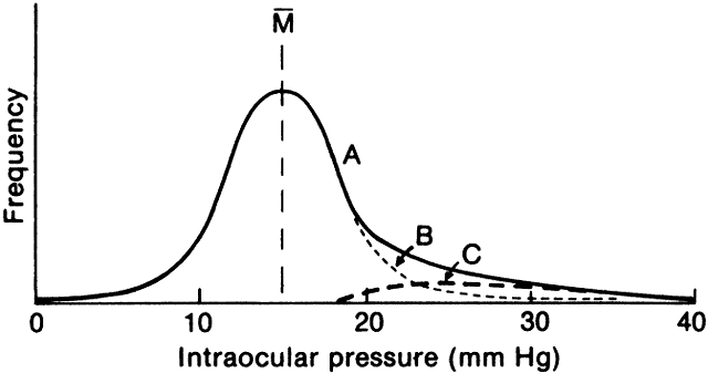 almost the same mean and scatter as the Leydhecker study.8,113 Although there is excellent agreement regarding the mean intraocular pressure, determining the lower and particularly the upper limits of normal is much more difficult. The classic method for determining the upper limit of normal is to assume that the values for intraocular pressure are distributed in a “normal” (gaussian) fashion. Under this assumption, the normal values cluster symmetrically on either side of the mean. If one arbitrarily chooses a point 2 standard deviations above the mean as the upper limit of normal (about 20.5 mmHg), 95% of the population will have values between 10.5 and 20.5 mmHg and 2.5% of the population will be included as abnormal. Alternatively, if one chooses 2.5 standard deviations above the mean as the upper limit of normal (about 24 mmHg), then less than 1% of the normal population be included as abnormal. Unfortunately, the distribution of intraocular pressure in the population does not fit a bell-shaped gaussian curve.2,8 Instead, there is a skew to the right (Fig. 3), meaning that the number of people who have intraocular pressures higher than the mean is greater than the number having pressures lower than the mean. This situation arises with many physiologic parameters, including blood pressure and fasting blood sugar. Gaussian statistics cannot be accurately applied to a parameter that does not have a gaussian distribution. It has been assumed that two different populations explain the skewed distribution (see Fig. 3). The normal population has a true bell-shaped distribution of intraocular pressure. Superimposed on this normal curve is the population with glaucoma, with high pressures eplaining the long tail on the right side of the distribution curve. Because the upper end of the normal population and the lower end of the glaucoma population overlap, it is impossible to separate the glaucomatous individual from the high-normal individual using pressure criteria alone. Armaly114,115 proposed that if the normal population were divided into several subpopulations based on gender and age, the distribution curve of each of these subpopulations would be gaussian in nature. In a study of more than 2000 individuals, he found a slight increase of mean intraocular pressure in each decade above the age of 40. In addition, in people 40 years of age and older, women had slightly higher pressures than men. The notion that age has an independent effect on intraocular pressure has been challenged. Large cross-sectional studies of almost 200,000 Japanese subjects by Shiose actually show a decrease in intraocular pressure with age. Shiose suggested that the Japanese data may be reconciled with Western data by postulating that age normally leads to a reduction in intraocular pressure, but this effect is overcome in Western populations by the increased prevalence of systolic hypertension and obesity, both of which are associated with increased intraocular pressure.116 This issue can only be resolved by long-term observations of individuals and not by cross-sectional methods. In the population as a whole, the right and left eyes have equal pressures. The difference between the two eyes rarely exceeds 4 mmHg. An abnormality should be suspected whenever a greater difference is found consistently.8 Armaly's studies on various populations in Iowa suggest that the level of intraocular pressure is inherited as a polygenic multifactorial trait.117 The effects of a common environment are less clear; two studies comparing the intraocular pressure of spouses had contradictory results.117,118 |