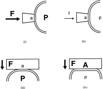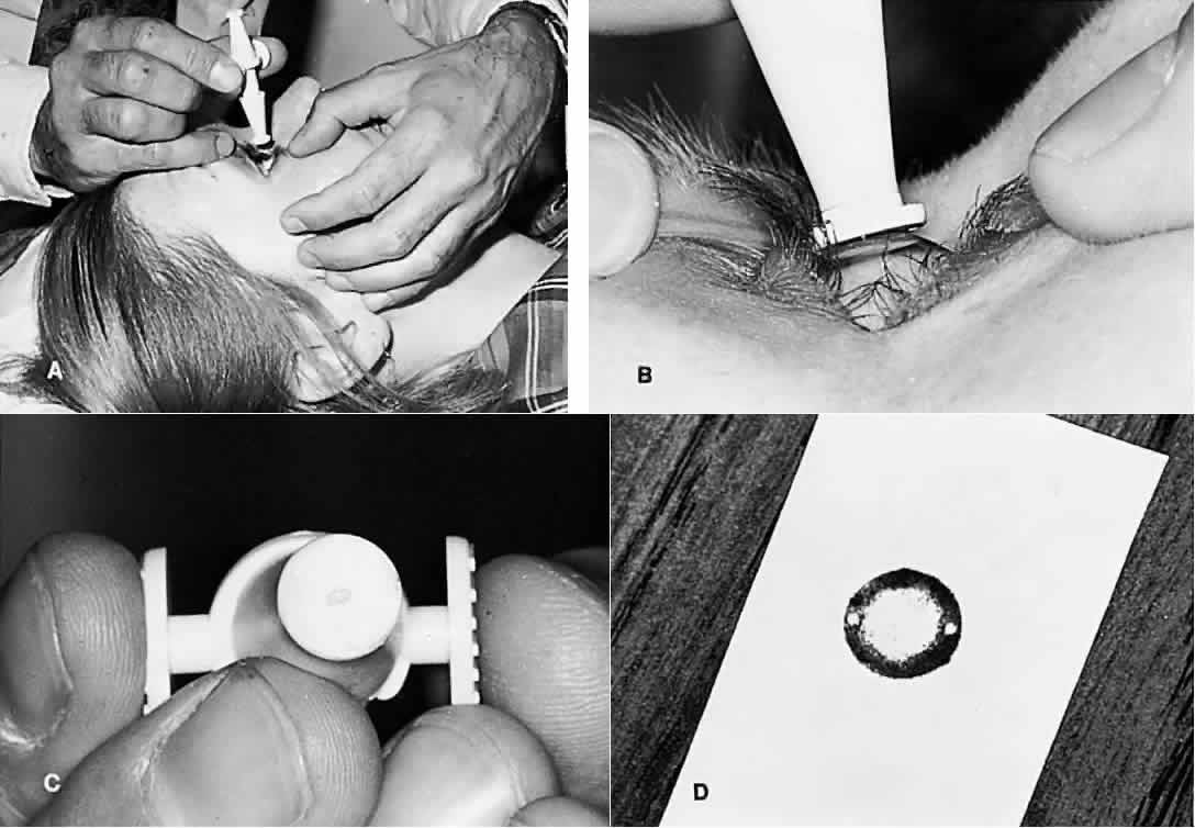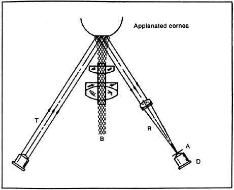 its advantages and disadvantages, and none is ideal. Some general principles apply to any method of measuring intraocular pressure. Extraneous factors that can influence the pressure reading must be avoided. The fingers of the examiner can press on the eyelid or eye while holding the lids apart, raising the intraocular pressure. Squeezing of the eyelids, eye movements, a tight collar or necktie, and repetitive measurements, particularly with Schiotz tonometry, can affect the intraocular pressure reading. MANOMETRY Intraocular pressure is higher than atmospheric pressure; therefore, if a small hollow needle is inserted into the anterior chamber, aqueous humor flows out through the needle. If the needle is attached to a reservoir of fluid that is raised just high enough to prevent any loss of aqueous, the height of the column of fluid, usually calibrated in centimeters of water or millimeters of mercury, reflects the intraocular pressure (Fig. 4). Movement of the fluid column caused by changes in intraocular pressure can be detected by an electronic strain gauge. Manometry is most used as a laboratory technique in performing continuous pressure measurements over time, evaluating the effect of physiologic and pharmacologic manipulations on pressure, and studying aqueous humor dynamics in postmortem eyes.4,121 The ethical use of manometry in living human eyes is restricted to eyes undergoing enucleation or intraocular surgery.122 This places constraints on the length of time manometry may be performed. In addition, these eyes may harbor significant ocular pathology affecting intraocular pressure. Intraoperative data obtained from diseased eyes may not apply to normal eyes. APPLANATION TONOMETRY The pressure inside a flexible sphere with thin walls can be closely approximated by knowing the force necessary to just flatten (applanate) a given area of the sphere. These parameters are related by the formula, pressure = force/area (Imbert-Fick law). One can either measure the force necessary to flatten a fixed area or measure the area flattened by a fixed force. Both methods have been used in designing tonometers (Fig. 5).1,4 Fixed-Force Tonometers Maklakoff in 1855 developed the first practical applanation tonometer.1 This instrument was a metal cylinder of known weight with a flat bottom. A dye was smeared on the anesthetized cornea and with the patient supine, the cylinder was allowed to rest on the cornea. The applanated area of cornea transferred the dye to the tonometer, and the area of applanation could be calculated from the diameter of the circle of dye on the tonometer bottom. The pressure could be derived from the Imbert-Fick formula because the applanating force (the weight of the tonometer) was known. The Maklakoff tonometer has several disadvantages. The relatively large applanation area and heavy weight of this tonometer raises the intraocular pressure above its resting state (Po) to a higher level (Pt) during measurement. The Maklakoff tonometer records this higher pressure (Pt) rather than the “undisturbed” intraocular pressure (Po). It is possible to calibrate the tonometer in such a way as to derive Po from Pt but it must be assumed that most eyes respond in the same way to tonometer placement. Also, the slightest movement of the eye or examiner smears the ink spot, making it larger than the actual area of flattening. This leads to an underestimate of the intraocular pressure.1,2,4 Posner has revived this kind of tonometer for clinical use (Fig. 6).123 His version is plastic, which reduces its weight and the discrepancy between Po and Pt. Ink is smeared on the tonometer footplate. When the tonometer rests briefly on the eye, the ink from the footplate is transferred to the flattened area of the cornea. The area on the footplate that is devoid of ink corresponds to the area of applanation. The footplate is then pressed onto a sheet of paper, and the diameter of the inkless area may be converted to the intraocular pressure. The Posner-Inglima tonometer has the advantage of being inexpensive and disposable. It can be used at home or whenever cleaning and sterilization of a tonometer are impractical. Fixed-Area Tonometers GOLDMANN APPLANATION TONOMETRY. In 1888, Fick devised a tonometer that maintained a fixed area of applanation.124 The intraocular pressure was determined by measuring an adjustable force necessary to flatten this predetermined area of the corneal surface. In the 1950s, Goldmann modernized this concept and developed the tonometer that has become the standard against which all others are judged.125 The applanating surface of the Goldmann tonometer has a diameter of 3.06 mm placed in the center of a plastic cylinder of 7 mm total diameter. The plastic cylinder is attached to an arm pushed forward through a spring-loaded knob. The amount of force on the cylinder is precisely controlled and can be read from a scale on the knob. The device is mounted on a slit-lamp biomicroscope (Fig. 7).1,4 To determine the intraocular pressure, topical anesthetic and fluorescein dye are placed in the eye. The dye mixes with the tears and fluoresces a brilliant yellowish green when activated by cobalt blue light. When the corneal surface is flattened by the plastic cylinder, the tear layer is squeezed out from the applanated surface, and the tear meniscus is seen through the clear center of the plastic cylinder as a ring of fluorescence. The force knob is adjusted until the applanated area is exactly 3.06 mm in diameter. The Goldmann tonometer uses an ingenious optical method to allow this adjustment to be precise: two prisms are positioned in the plastic cylinder, apex to apex, in such a way that the fluorescent ring of the tear meniscus is seen as two half rings (mires), one above and one below. The orientation and power of the prisms are such that the two mires are optically separated by exactly 3.06 mm. The force knob is turned until the inside edges of the end of each split ri
