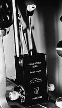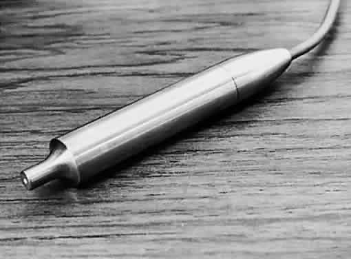 Scleral rigidity can be calculated from the Friedenwald nomogram as follows (see Fig. 11): Two different weights are used to obtain two tonometer scale readings (two different values for Pt). A more accurate method is to use the applanation tonometry value as Po and one Schiøtz reading as Pt. The slope of the line formed by joining these two points gives the scleral rigidity (mmHg change in pressure per cubic mm change in volume). In clinical practice, scleral rigidity measurements are not made as often as they should be. This introduces significant errors and makes dependence on Schiøtz tonometry hazardous. Errors of Schiøtz Tonometry In addition to the potentially large error that an abnormal scleral rigidity can produce in Schiøtz tonometry, other errors may arise. The footplate must be the right curvature and size, and the total instrument must be the correct weight for the Friedenwald tables and nomogram to apply.2 Poor attention to detail in manufacture can make a tonometer totally unreliable. The American Academy of Ophthalmology has established a Committee on Tonometer Standardization, which has set rigid criteria for Schiøtz tonometers. A tonometer certified by this committee or by a laboratory committed to the same standards can be expected to perform reliably. Dirty tonometers are also potentially inaccurate. If tears inside the barrel are allowed to dry, the friction between the barrel and plunger is increased. A common error is to autoclave the tonometer without first carefully cleaning it. The secretions in the barrel harden, causing the plunger to stick. If the tonometer is not placed perpendicular to the corneal surface, additional friction is produced between plunger and barrel. A cornea that is scarred, edematous, or of abnormal curvature gives inaccurate readings with the Schiøtz. A corneal abrasion can be caused by the plunger if the eye or tonometer moves during measurement. The Schiøtz tonometer must be used in the supine position or in the sitting position with the head back far enough to be horizontal. An initial blink or avoidance reaction may occur as the patient sees the tonometer descending toward his or her eye. Despite the many potential sources of error, the Schiøtz tonometer has been a remarkably useful instrument for the past 75 years. Compared with most other methods of tonometry, it is inexpensive, simple, portable, and easily sterilized. Patients and their families can be taught how to use it for home tonometry. Although largely replaced in the United States by Goldmann or other types of tonometry, the Schiøtz tonometer still has a place in clinical practice, particularly if checked for accuracy against Goldmann tonometry in each patient. COMBINATION APPLANATION-INDENTATION TONOMETRY The McKay-Marg, Tono-Pen (Intermedics Intraocular, Pasadena, CA), and pneumotonometer instruments have properties of both applanation and indentation tonometers. The original McKay-Marg tonometer is no longer manufactured and has been supplanted by a handheld and battery-operated version, the Tono-Pen. Mackay-Marg Tonometer The Mackay-Marg tonometer uses a microplunger that protrudes a small amount from a flat footplate of a tubular handpiece (Fig. 13). The microplunger is connected to a sensitive transducer, which converts plunger displacement into an electrical signal that is recorded on a paper chart, much like an electrocardiogram.4,156 The shape of the tracing reflects the stages of applanating the cornea (Fig. 14). As the plunger is pressed into the cornea, both intraocular pressure and corneal elasticity push back, as with the Schiotz tonometer. During this phase of measurement, a rising trace is recorded. When the plunger no longer protrudes from the footplate, the footplate has applanated the cornea. The force of corneal elasticity is taken off the plunger, resulting in a slight drop in the trace. As the plunger and footplate are pressed farther into the cornea, the unit raises intraocular pressure by displacing aqueous humor, and a rise in the pressure is again recorded. The true intraocular pressure, Po, representing the point of applanation, is the bottom of the trough in the pressure recording. Note that there is no disturbance of the intraocular pressure until this point is passed.3,157,158 The Mackay-Marg tonometer is the most accurate tonometer in scarred or edematous corneas because the intraocular pressure reading is independent of corneal elasticity.159 This has been confirmed manometrically. The end point is measured electrically; therefore, the reading is unaffected by optical factors such as an irregular cornea or high astigmatism. Several readings may be required to obtain a good tracing, however, and the interpretation of the readings may be difficult.2 The values from Mackay-Marg tonometry correlate well with those from Goldmann tonometry.6 The mean values from the Mackay-Marg tonometer, however, may be 1.5 to 3 mmHg higher than those from the Goldmann tonometer on normal corneas.2 One study160 has seriously questioned the reliability of individual readings but most studies indicate a reasonable degree of reliability.2,4 Phelps and Phelps pointed out that even with Goldmann tonometry there may be significant variation from reading to reading in the same patient within a short time.161 Tono-Pen The Tono-Pen is a handheld, battery-operated version of the Mackay-Marg tonometer (Fig. 15). The tip is covered by a disposable latex cover and applied perpendicularly to gently indent an anesthetized cornea. Each measurement requires several applanations. An acceptable applanation is indicated by an audible click after contact with the cornea. A microprocessor averages several acceptable waveforms and gives a digital readout of intraocular pressure on a liquid crystal display, with an estimate of the variability between the component readings. Studies comparing the Tono-Pen with the Goldmann applanation tonometer revealed a reasonable correlation be