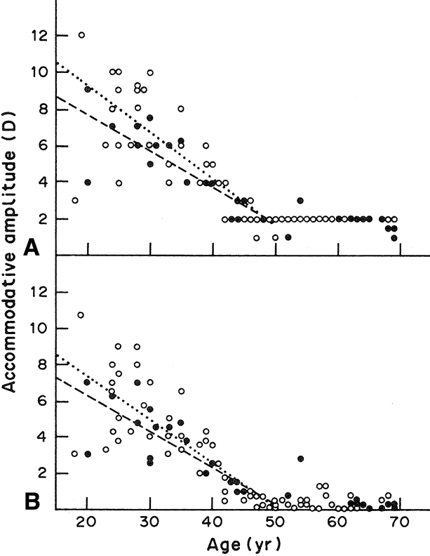 can cause detectable spherical aberration (variability of focal length).1 For the eye to focus the image of a near object on the retina, there must be an increase in ocular refractive power. The mechanism that achieves this change is accommodation, and the eye at rest is said to be unaccommodated. The mechanism of accommodation varies among species.2,3 Not all animals accommodate. Some fish retract their lenses to focus on distant objects, whereas in snakes and frogs and many mammals, the position of the lens moves forward for near vision. In certain other fish and horses, the retina is tilted so that the lens-retina distance alters generally in a dorsal-ventral plane. In humans, the ability of the eye to alter focus is facilitated by a change in the shape of the lens; there is no change in the curvature of the cornea or the length of the eyeball. In the human, the accommodative mechanism involves the ciliary muscle, the zonules, and the lens itself. However, the role of the lens is passive in the sense that its shape change takes place as the result of contraction or relaxation of the ciliary muscle. When the ciliary muscle is relaxed, the zonules are under tension, exerting a centrifugal force on the lens equator that causes the lens to take on a flattened form. Contraction of the ciliary muscle makes it shorten and move forward and toward the equator of the lens. As a result, the zonules become less taut; their pull on the lens capsule is reduced; and the lens changes to its relaxed, more spherical, and, thus, accommodated, shape. This results in an increase in the dioptric power of the lens, allowing a near object to come into focus on the retina. To shift the focus back from a near to a distant object, the ciliary muscle relaxes and the elasticity of Bruch's membrane causes it to move posteriorly, widening the ciliary ring so that the zonules become tense once again and flatten the lens. The principle of this currently accepted theory for the mechanism of accommodation was first suggested by Helmholtz4 in 1855, and the important role of the lens capsule was emphasized by Fincham5 in 1937. During accommodation, the principal change in the lens shape is seen at the anterior surface. The anterior surface of the unaccommodated lens has a spherical radius of curvature of about 12 mm. When the eye accommodates, the anterior surface tends to bulge centrally, attaining a radius of curvature of about 3 mm. The more peripheral anterior surface shows relatively little or no increase in curvature. Minimal changes occur in the curvature of the posterior lens surface; Fincham5 detected changes from 5.18 to 5.05 mm in one case and from 5.74 to 4.87 mm in another case for an accommodative change amounting to 8 diopters. The axial thickness of the lens increases during accommodation and the diameter decreases. The increase in lens axial thickness is paralleled by a shallowing of the anterior chamber of the eye. The amount that an eye can alter its refractive power between focus on a far object and a near object is called the amplitude of accommodation. The amplitude of accommodation decreases progressively with age, a condition known as presbyopia6 (Fig. 3). The decline in accommodative amplitude means that the near point becomes more distant from the eye and, thus, small objects must be held farther away to be seen clearly. It is doubtful that there is a single cause of presbyopia. Theories proposed to explain the development of presbyopia include changes in the elastic properties of the capsule, a change in the deformability of the lens cell mass, loss of elasticity in Bruch's membrane, and weakening of the ciliary muscle.7–9 There is little evidence to support the concept of a weakened ciliary muscle, although age-related morphologic changes are known to occur in this tissue.10 In presbyopic eyes, the ciliary muscle is still able to contract vigorously under the influence of pilocarpine.11 Presbyopia does not appear to be simply the result of changes in the rate of lens thickening or anterior chamber shallowing with age.12 Changes in the aging capsule have been studied by Fisher, 13 who concluded that reduction in capsular elasticity in the senile lens is a contributing factor in presbyopia. The principal cause of presbyopia was once considered to be “lenticular sclerosis,” a progressive hardening of the lens with age so that it becomes less deformable. However, in his study of lens mechanics, Fisher14 determined that age-related changes are not entirely consistent with the timetable for the onset of presbyopia. |