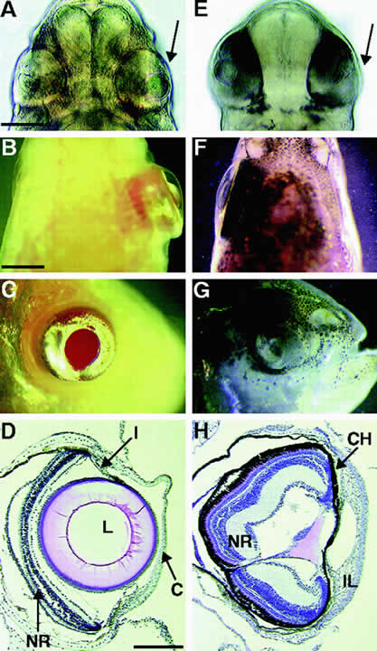 the developing lens. The cells of the lens vesicle are positioned so that their apical surfaces face inward and their basal surfaces are in contact with the lens capsule. The cells at the posterior of the lens vesicle elongate and by approximately the 16-mm stage (7-weeks gestation) they have grown to form primary lens fibers that fill the cavity of the lens vesicle. The primary lens fibers eventually lose their nuclei and organelles but what remains of each cell is retained throughout life as the “embryonic nucleus” of the lens. Although the cells at the posterior portion of the embryonic lens grow to become primary lens fibers, the cells at the equator have a different fate. They divide and give rise to new cells. In most cases the newly formed cells differentiate and elongate to form secondary lens fibers. A few of the newly formed cells probably remain as undifferentiated epithelial cells, populating the anterior epithelial monolayer as the lens grows. The equatorial or germinative zone of the anterior lens epithelium continues to divide and produce secondary lens fibers throughout life. It is the only region of the adult lens where the cells remain capable of mitosis. Neither lens fibers nor the central anterior lens epithelium undergo cell division. As the cells in the equatorial zone of the epithelium elongate, the portion of each cell that is anterior to the nucleus grows forward under the undifferentiated epithelium, lying just beneath the anterior capsule; the posterior portion of each growing lens fiber simultaneously elongates backward beneath the posterior capsule. When the ends of similarly elongated cells meet each other close to either the anterior or posterior pole of the lens, both cells stop growing. New fiber cells are formed continually throughout life and older cells are displaced toward the center of the lens. Like tree rings, the youngest cells are at the lens periphery, the oldest at the center. Understandably, the lens center becomes denser. It is referred to as the lens nucleus. The more superficial layers of younger fiber cells are called lens cortex (see diagram, Fig. 5). An interesting feature of the differentiation of lens epithelium into lens fibers is that as the fibers are displaced to the interior of the lens, they reach a stage at which they lose their nuclei and other cytoplasmic organelles. The zonular fibers, which are suspensory ligaments that support the lens, develop from the neuroepithelium at approximately the 65-mm stage (3-months gestation), when the ciliary body and iris begin to develop from the optic vesicle. At the 110-mm stage (4-months gestation) the zonules are well developed, running from the inner surface of the ciliary body to the lens capsule. Still later, at the 240-mm stage (7-months gestation), the vascular hyaloid system within the vitreous regresses; it is absent by 8.5-months gestation, leaving the lens without a blood supply for the rest of its life. The regulatory factors involved in lens development are complex and have been nicely reviewed by McAvoy and colleagues15 and van Doorenmaalen.16 Lens induction depends on the interaction between presumptive lens ectoderm and other tissues, particularly the retina. Transcription factors Pax-6, as well as Eya, Six, Sox, and Prox play an important role.15 The communication between developing tissues is a two-way street; signals emanating from the lens have a significant influence the development of other parts of the eye17 (Fig. 6). The involvement of specific lens-inducing substances in lens differentiation seems certain.15,18,19 Chamberlain and McAvoy19 have suggested that fibroblast growth factor promotes lens cell differentiation, and Beebe and colleagues18 demonstrate a role for insulin-like growth factors. |