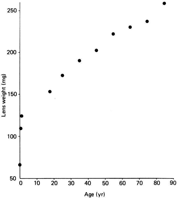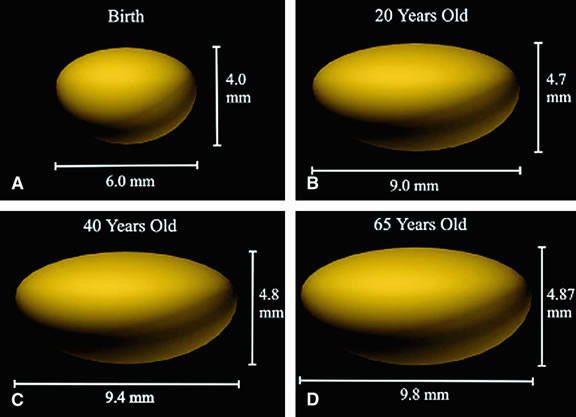 to the vitreous. Cell division and, thus, growth of the lens continue throughout life; as new lens cells are formed, the older cells are displaced toward the interior of the lens. As a result, the lens grows in size and weight as humans age20 (Figs. 7 and 8). It has been estimated that the human lens thickness increases at about 0.02 mm per year.21,22 The anterior-posterior dimension of the lens in the newborn is 3.5 to 4.0 mm, reaching 4.75 to 5.0 mm at 90 years of age. The equatorial diameter in infants is about 6.5 mm, increasing to 9.0 with age. The radius of curvature of the anterior surface of the lens is 8 to 14 mm, and at the posterior surface it is 4.5 to 7.5 mm. There is, however, variation in curvature with age and accommodation.