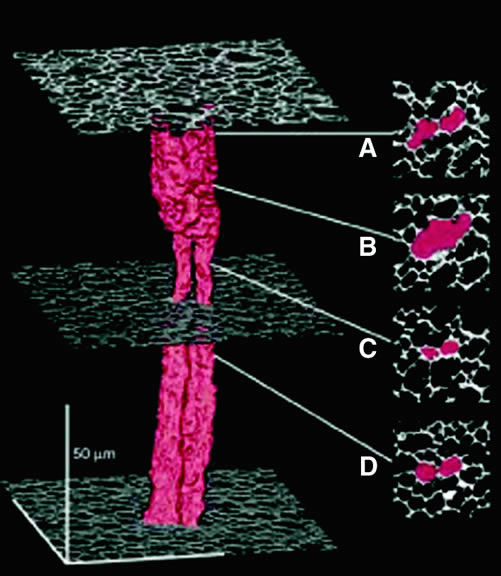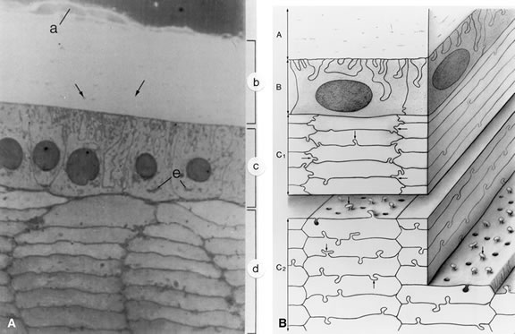 wide.35 The lateral surfaces of these epithelial cells are richly interdigitated. Toward