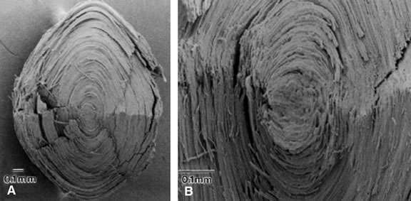 microscopy reveals a fibrillar structure with a more
