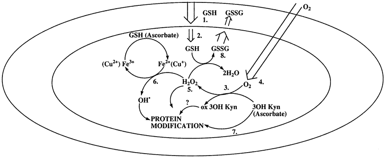 In humans and many other species, ascorbic acid is found at high concentrations in the lens, sometimes higher than in aqueous humor.102 Ascorbic acid is not synthesized in the lens, but there is evidence that a specialized transport mechanism exists to transport it inward from the surrounding fluid.103,104 The role of ascorbic acid in the lens is the subject of some debate. It is likely to function as a scavenger of free oxygen radicals. Paradoxically, however, ascorbic acid might also be pro-oxidant, because together with light and the presence of a metal ion, ascorbic acid will generate hydrogen peroxide.105,106 Moreover, ascorbic acid might play a role in protein glycation and the development of chromophores that occur in older lenses. |