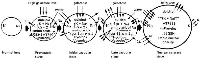 the lens.205,206 In diabetes mellitus the blood glucose level is elevated, resulting in an increase in aqueous humor glucose levels to nearly 90% of blood levels. As a result of the increased level of glucose in the aqueous humor, more glucose enters the lens by facilitated diffusion. In the normal lens virtually all the glucose entering is metabolized by way of hexokinase to enter the glycolytic pathway. However, at higher concentrations of glucose the enzyme aldose reductase is activated; this enzyme converts glucose to sorbitol, which accumulates within the fibers. Similarly, in galactosemia, a condition caused by deficiency of galactose-1-phosphate-uridyl transferase or galactokinase, galactose enters the lens and is metabolized through aldose reductase to dulcitol (galactitol). Dulcitol also accumulates within the lens fibers, causing an influx of water and swelling of the lens cells and eventually opacification (Fig. 20). Galactose cataract forms more rapidly than diabetic cataract because of the higher affinity of aldose reductase for galactose. The situation is worsened because the lens is unable to metabolize dulcitol. In contrast, sorbitol, the sugar alcohol of glucose, can be oxidized to fructose by the enzyme polyol dehydrogenase.