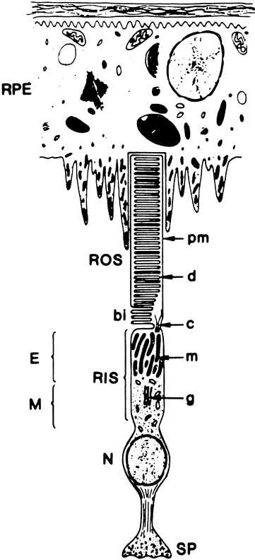 ganglion cell axons, which collectively form the optic nerve. The function of the retina, to transduce light into an electrical signal that can be transmitted to the brain, is accomplished through the photolysis of light-sensitive visual pigments that are present in the outer segments of photoreceptor cells. A schematic of a photoreceptor cell, presented in Figure 2, illustrates the high degree of polarization of this structure. The proximal end of the photoreceptor cell is a nerve terminal, which makes chemical synapses with horizontal and bipolar cells. The inner segment contains the organelles, which are responsible for the metabolic activity of the cell. The biosynthesis of proteins and lipids occurs on the endoplasmic reticulum in the myoid region of the inner segment, and energy (e.g., adenosine triphosphate [ATP], guanosine triphosphate [GTP]) is generated in the mitochondria in the ellipsoid region of the inner segment. The inner segment is connected to the distal end of the photoreceptor cell, the outer segment, by a narrow connecting cilium. Outer segments occupy the subretinal space and are made up of stacks of membrane discs enclosed within a plasma membrane. The subretinal space is an organized network of fibers made up of complex proteoglycan macromolecules that surround the outer segments of both rod and cone cells. This fibrous network is called the interphotoreceptor matrix. The distal tips of the outer segments are in intimate contact with epithelial processes of the RPE. This contact is essential for the survival of photoreceptor cells. Disruption of the interphotoreceptor matrix or separation of the outer segments from the pigment epithelium leads to a retinal detachment. Four types of photoreceptor cells are found in the human retina, and these are determined by the types of light-sensitive protein photopigments that are contained in their outer segment membranes. Each photopigment has a distinctive absorption spectrum. Rhodopsin is the photopigment of the rod outer segment (ROS) and absorbs light maximally at 500 nm. There are three types of cone photoreceptor cells; each contains only one type of photopigment. The cone pigments are named for the color of light they absorb: blue (440 nm), green (540 nm), and red (570 nm). Cone photoreceptor cells are arranged in a mosaic pattern throughout the macula. The outer segments are made up of stacks of membranous discs surrounded by a plasma membrane (see Fig. 2). The plasma membrane is continuous with the inner segment through the narrow connecting cilium. In ROS, these discs are free-floating, except for a few at the base, and are not continuous with each other or with the plasma membrane. Cone outer segment discs are not free-floating, so the plasma and disc membranes are continuous. |