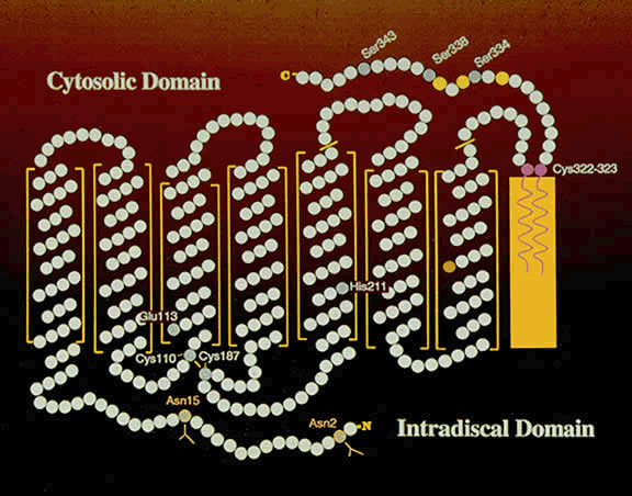 large enough for analysis. ROD DISC MEMBRANES The chemical makeup of the disc membranes is relatively simple. The membrane structure is a bilayer; about half of the molecules are integral proteins, and the other half are lipids. Phospholipids make up about 90% of the disc membrane lipids. Phosphatidylcholine (40% to 45%) and phosphatidylethanolamine (35% to 40%) are the major phospholipids, but relatively large amounts of phosphatidylserine (10% to 15%) are also found. Minor phospholipids (about 5%) include phosphatidylinositol (PI), phosphatidylinositol 4-phosphate (PIP), phosphatidylinositol 4,5-bisphosphate, and sphingomyelin. The cholesterol content of the discs is less than 10%, which is lower than what is usually found in plasma membranes. Small amounts of free fatty acids and diacylglycerol are also found in disc membranes. An interesting feature of cholesterol in the discs is that the most basal discs have higher levels of cholesterol than those near the apical tips.1,2 There does not appear to be a similar gradation in phospholipid or fatty acid distribution. The fatty acids of ROS lipids are somewhat unique in that the major component is docosahexaenoic acid (22:6n-3), a long-chain polyunsaturated fatty acid with six double bonds.3 This fatty acid also occurs in large amounts in synaptic terminals in the central nervous system but is not found to any great extent in nonneural tissues. ROS contain integral (part of the membrane), peripheral (associated with the membrane), and soluble proteins. The major integral protein in rod disc membranes is the visual pigment rhodopsin (approximately 90%), a glycolipoprotein of about 40,000 molecular weight. The interaction of rhodopsin in the disc membrane is shown schematically in Figure 3. Rhodopsin has seven α-helical loops that traverse the lipid bilayer.4 These are important in some of the interactions of rhodopsin with other ROS proteins. Its C terminus is oriented toward the cytoplasmic surface of the disc, and its N terminus, which contains two carbohydrate side chains, is oriented toward the intradisc space. The C terminus contains six residues of serine and threonine, three of which are phosphorylation sites5,6 (serines 334, 338, and 343; see Fig. 3). 11-cis-Retinal is the chromophore of rhodopsin and is linked chemically by a Schiff base to lysine-296. The loops of rhodopsin outside of the lipid bilayer are important in the binding of peripheral and soluble proteins following photobleaching. Two adjacent cysteine molecules near the C terminus contain thioesters of palmitic acid, whose hydrophobic tails are embedded in the lipid bilayer7 anchoring the C terminus to the disk membrane and creating a specialized surface region—a fourth cytoplasmic loop (amino acids 310 to 321).8,9 This anchoring of the C terminus of rhodopsin is expected to cause conformational constraints.10 It was suggested that the fourth cytoplasmic domain created by the insertion of the palmitoyl groups into the membrane play a role in the binding and activation of transducin. Another integral protein present in ROS in small amounts (1% to 2%) is peripherin/rds, which appears to be located at the edges of the discs near the plasma membrane.11 Nonintegral proteins of ROS include a cyclic guanosine monophosphate (cGMP)-specific phosphodiesterase, guanylate cyclase, arrestin (S antigen, 48K protein), rhodopsin kinase, protein kinase C, other protein kineses, phosphoprotein phosphatase, phosducin, transducin, phospholipase C, alcohol dehydrogenase, glucose-6-phosphate dehydrogenase, glutathione peroxidase, glutathione reductase, diacylglycerol kinase, PI kinase, PIP kinase, recoverin, and probably others yet to be discovered. Several of the ROS proteins are directly involved in visual transduction and are discussed later in greater detail. ROD PLASMA MEMBRANES Because the discs are derived from the plasma membrane, one would think that the chemistry of the disc and plasma membranes would be the same. However, this is not the case. Studies have now shown that the ROS plasma membrane has a different lipid and protein composition.12,13 The major differences in the lipids are a larger amount of cholesterol and lower level of 22:6n-3 in the plasma membrane. Rhodopsin is present in the plasma membrane, although at a much lower levels than in the discs. The plasma membrane contains the sodium channel, an integral protein that controls the passive entry of sodium (and, to a lesser extent, calcium) into the outer segment in the dark. Calcium is extruded from the outer segment by a calcium-sodium exchanger in the plasma membrane, and sodium is extruded from the photoreceptor cell by ouabain-sensitive pumps located in the ellipsoid region of the inner segment. This passive influx of sodium in the dark is the dark current described by electrophysiologists. CONE VISUAL PIGMENTS All three cone pigments have been identified and their amino acid sequence is known. All three share sequence homologies with rhodopsin, suggesting that all four visual pigments are derived from a common ancestral gene. Point mutations involving single amino acid substitutions, as well as cone pigment genes rearrangements have been described in color-blind individuals.14,15 Thus, color blindness can result from a single point mutation in the DNA encoding one of the color pigments, leading to the synthesis of a nonfunctional visual protein. Alternatively, recombinational rearrangements in the red/green pigments genes can also lead to color blindness.15,16 These proteins either do not form a photolabile molecule with 11-cis retinal or do not activate transducin and, therefore, fail to activate the phosphodiesterase when photobleached. In some cases of color pigments gene rearrangements a functional pigment that absorbs photons and initiates visual excitation can be generated. This is the so-called anomalous color blindness, which is identified psychophysically when the test subject does not match the “