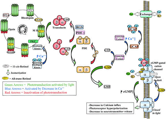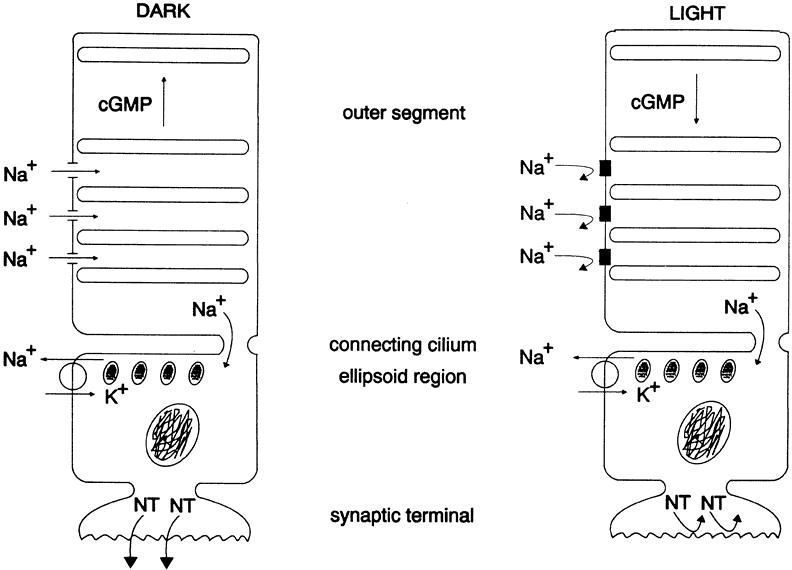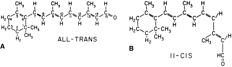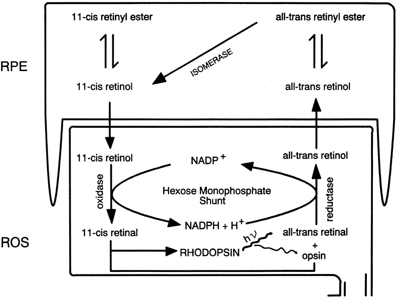 PHOTOBLEACHING OF RHODOPSIN The 11-cis-retinal chromophore of rhodopsin is oriented perpendicular to the fatty acid chains in the lipid bilayer of the ROS discs, a position that enhances photon capture. A single photon can isomerize the cis double bond, producing all-trans-retinal (Fig. 4). The conversion of 11-cis-retinal to all-trans-retinal is the only known action of light in the retina and leads to dramatic changes in the three-dimensional structure of retinal, which ultimately provokes conformational changes in rhodopsin. These conformational changes have been captured at low temperatures by a number of investigators who have studied their spectroscopic and kinetic properties. The so-called bleaching cascade of rhodopsin is presented in Figure 5. The first stable intermediate at physiologic temperatures is metarhodopsin II, and its formation from metarhodopsin I within milliseconds of photon capture leads to visual excitation. Each of these intermediates is a different conformational state of photoactivated rhodopsin (opsin) that results from the cis to trans isomerization of retinal. THE VISUAL CYCLE All-trans-retinal produced by the photoactivation of rhodopsin must be isomerized enzymatically to 11-cis-retinal, the substrate for regeneration of rhodopsin. The isomerase enzymes are located in the RPE28; no isomerase activity has been found in the retina. Therefore, the transport of all-trans-retinal to and from the RPE is an important part of the visual cycle, which is depicted in Figure 6. All-trans-retinal released from photolyzed rhodopsin is reduced rapidly to all-trans-retinol by the enzyme retinol dehydrogenase. The cofactor nicotinamide adenine dinucleotide phosphate in its reduced form (NADPH) is generated by glucose-6-phosphate dehydrogenase, an enzyme of the hexose monophosphate shunt. In low concentrations, all-trans-retinol can disrupt membranes. Therefore, it must be removed rapidly from the outer segments to the RPE to prevent damage to the discs. The mechanism of transport of all-trans-retinol to the RPE is not understood. The interphotoreceptor matrix contains high levels of interphotoreceptor retinoid binding protein (IRPB), which is thought by some to move retinoids between the ROS and the RPE.29 However, other evidence has shown that retinol can move between the two cells by simple diffusion.30 Both mechanisms most likely are used. Once in the RPE, all-trans-retinol is converted to all-trans-retinol esters, which are isomerized to 11-cis-retinol by the enzyme retinoid isomerase.31 After the isomerization event, 11-cis-retinol is returned to the ROS, where it is oxidized to 11-cis-retinal and used for the regeneration of rhodopsin. RETINOL STORAGE AND TRANSPORT The pigment epithelium can store both 11-cis-retinol and all-trans-retinol as esters of palmitic, stearic, and oleic acids. This storage ensures the retina of a steady supply of 11-cis-retinal, even at the brightest light levels. However, the main organ for retinol storage is the liver. Retinol obtained from the diet or synthesized in the intestine from dietary carotenoids is transported to the liver in chylomicrons, where it is esterified to fatty acids and stored in small lipid droplets. For transport to other tissues, one molecule of retinol binds to a specific protein, serum retinol binding protein (SRBP), which complexes with another serum protein, prealbumin. This complex reacts with specific receptors on cell surfaces to deliver retinol to target cells. The plasma membrane of the basal surface of RPE cells has receptors that recognize and bind SRBP.27 VISUAL TRANSDUCTION For vision to occur, the message that a photon was absorbed in the outer segment must be transmitted to the synaptic terminal of the photoreceptor cell. This is accomplished through rapid communication between the disc and plasma membrane of the outer segment, mediated by the small water-soluble molecule cGMP.32 In the dark, the level of cGMP in the outer segments is high compared with other retinal cells (Fig. 7). At high concentrations, cGMP interacts with the sodium channel in the plasma membrane and keeps it open to the passive influx of sodium from the interphotoreceptor space. This depolarizes the cell, allowing neurotransmitter to be released from the synaptic terminal in the dark. In the light, the photobleaching of rhodopsin is followed rapidly (in milliseconds) by a precipitous decline in cGMP, leading to closure of the sodium channel and hyperpolarization of the photoreceptor cell. Neurotransmitter release is inhibited, causing hyperpolarization of horizontal cells and either hyperpolarization or depolarization of bipolar cells, depending on the cell type. Photoreceptor, horizontal, and bipolar cells respond to light with sustained, graded potentials rather than action potentials. The retina is, thus, allowed to make discriminations in intensity and duration of visual stimuli that would not be possible if the cells fired on an all-or-none basis. The control of cGMP levels in ROS is achieved through a series of biochemical reactions, depicted in Figure 8, and involves several proteins. The conformational changes in photoactivated rhodopsin (R*) lead to the binding of transducin (Tαβγ-GDP) to R* and the exchange of GTP for guanosine diphosphate (GDP). This complex dissociates into Tα-GTP, R*, and Tβγy. Tα-GTP reacts with a cGMP-specific phosphodiesterase (PDEαβγ) and removes the inhibitory subunit (PDEγ). Relieved of its inhibitor, the activated cGMP phosphodiesterase (PDEαβ hydrolyzes cGMP in the ROS cytoplasm. Two amplification steps are essential to achieve the rapid reduction in cGMP levels. The first occurs in the activation of transducin, when one molecule of R* can generate more than a hundred molecules of Tα-GTP. The second is at the enzyme level, where one PDEαβ molecule can hydrolyze thousands of molecules of cGMP. These two amplification steps translate the photolysis of one molecule of rhodopsin