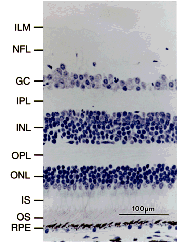 OVERVIEW The retina is composed of millions of neurons organized into several primarily cellular layers (Fig. 1). With light microscopy, one can readily recognize three cellular layers, which contain the cell bodies of neurons: the photoreceptor-outer nuclear layer, the inner nuclear layer, and the ganglion cell layer. Connections between these neural layers are made by processes that lie in the outer and inner plexiform layers. The retinal pigment epithelium (RPE) is a single layer of contiguous cells lying beneath the photoreceptors. Vision is initiated when the photoreceptors are activated by quanta of light. The resulting visual signals pass through the plexiform layer of neural processes and reach the bipolar cells in the inner nuclear layer. The signal is then passed through the inner plexiform layer into the ganglion cell layer and transmitted through the axons that form the optic nerve, and hence to the visual cortex. In the primate retina, the photoreceptors of the outer nuclear layer number about six million cones and 120 million rods. In addition to containing several types of bipolar cells, the inner nuclear layer contains horizontal cells and amacrine cells, both of which mediate lateral signal interactions that are important for spatial processing of vision. The horizontal cells lie in a row closest to the outer plexiform layer, and the amacrine cells lie in a row closest to the inner plexiform layer. The primate retina is not homogeneous from center to periphery. The central retina is specialized for cone vision, whereas the peripheral retina is organized better for rod vision. Cones are concentrated within the central-most retina and form the fovea, which is a rod-free area. The fovea is further specialized in that it contains only the photoreceptors; the second- and third-order retinal neurons are pushed to the side. This organization accomplishes two criteria that are important for fine vision: