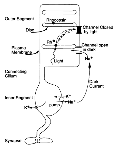 Meanwhile, the bipolar, horizontal, and amacrine cells that subserve vision processing from the densely packed foveal cones are displaced sideways into a parafoveal mound of neural tissue. Whereas cones are packed most densely in the fovea, the rod photoreceptors reach the highest concentration 20° to 30° from the fovea. Although the retinal neurocircuitry associated with rods does not allow for acuity of better than about 20/200, the high density of rods in the midperiphery still provides the maximal sensitivity for dim-light vision at this region. The retina is thinnest in the fovea, thickest in the parafovea and macula, and of intermediate thickness in the peripheral retina. One misconception is that cones are limited to the fovea and macula. This is obviously incorrect, since we can perceive color across our entire field of vision, from edge to edge. Since color is mediated exclusively by cones, this reinforces the concept that cones exist in the peripheral retina, although at a considerably reduced number compared to the macula. PHOTORECEPTORS Rod and cone photoreceptors are specialized for converting light into neural signals (Fig. 2). The earliest information about electrical activity of the photoreceptors came with Granit's identification of the PIII response of the ERG as deriving from this layer of cells. In the corneal ERG, PIII is the negative-going response that forms the a-wave when elicited with stimuli of medium to bright intensity. The a-wave is the earliest and negative wave of the ERG elicited with relatively bright flashes. During the 1960s, Brown and associates inserted a microelectrode into the monkey fovea and identified the ERG a-wave signal produced by cone photoreceptors. This provided the first information about the shape of the cone response when these cells hyperpolarize to a light flash. The next advance came from impaling individual photoreceptors, and subsequently by suction electrode recordings performed by Baylor and colleagues. Note that when a cell hyperpolarizes, the inside becomes relatively more negative compared to the outside. All this is relative, since cells normally are negative inside compared to the extracellular space. Thus the terms hyperpolarization and depolarization are with reference to the normal resting potential of the cell membrane. A depolarizing cell becomes less negative inside upon stimulation, whereas a hyperpolarizing response causes the cell membrane to become more negative. Photoreceptor “Dark Current” The process of translating light into electrical signals is termed transduction. The biochemical steps that are involved occur within the photoreceptor outer segments, beginning with isomerization of the vitamin A retinal from the cis to the trans form within the visual pigment. The protein portion of rhodopsin is called opsin and is arranged in the shape of seven helixes that span the membrane of the free-floating discs in the rod outer segment. Isomerization of retinal from cis to trans form opens up the space of the opsin helixes and allows rhodopsin to interact with transducin. The subsequent cascade of events leads to a decrease of cyclic guanosine monophosphate (cGMP) which closes the ionic channels on the plasma membrane of the rod outer segment. This channel normally is open, which allows entry of sodium into the rod outer segment in the dark, with a compensatory extrusion of potassium from the rod inner segment to balance the net charge within the cell. This circulating “dark current” between the inner and outer segments maintains the rod in a relatively depolarized state. Closure of the cGMP-sensitive channel by light interrupts the dark current. Interrupting the influx of sodium, which carries positive charge into the cell, causes the photoreceptor to hyperpolarize. This intracellular voltage change is conveyed to the synaptic terminal, where the visual signal is transmitted to the bipolar and horizontal cells. To a first-time student of retinal neurophysiology, these events initiated by light may appear the reverse of what would be expected. Rather than initiating a positive response in the rod, light actually suppresses a current that exists in the dark. Furthermore, in the dark, glutamate is released from the photoreceptor synapse (its neurotransmitter), and glutamate release is stopped upon signaling by light. The outcome of signaling light, however, is the same in that light causes a signaling difference to reach the bipolar cells as the message that vision was initiated. Rod photoreceptors are highly efficient and can signal the isomerization event from a single photon of light. Each rod contains approximately 109 rhodopsin molecules, and the probability is remarkably high that every photon will be absorbed as it passes through the length of the rod outer segment. Fortunately, rhodopsin molecules are very stable in the dark and have a 400-year half-life before they spontaneously isomerize. Occasionally, however, a rhodopsin molecule will undergo spontaneous isomerization even in the absence of light, and this thermal noise results in a spurious signal being transmitted as “vision.” Fluctuations in the photocurrent of single rods can be observed in the dark, with a frequency of approximately one every few minutes in single unit recordings of rods. These spurious events are indistinguishable from rod responses initiated by true light and are called dark-light (alternatively called dark-noise). One can experience dark-light as the infrequent, spontaneous speckles seen after being in a fully darkened room for at least 1 hour. Dark-light is a temperature-dependent event and is more frequent with higher body temperature. When they are in constant light, rod photoreceptors become less sensitive and do not respond as readily to individual photons. The rod response saturates in bright sustained light and renders the rod incapable of further signaling. Half-saturation occurs when each rod absorbs approxima