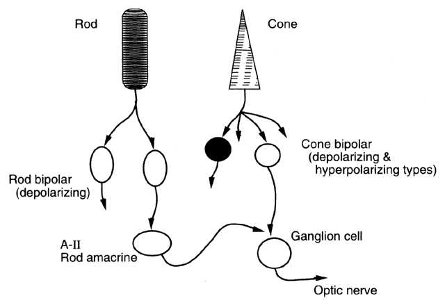 to study vision signals that reach the cortex. This chapter describes the generation of electrical signals beginning with the photoreceptors and then follows the signals through the retinal microcircuit. This chapter attempts to provide a synthesis of information from many sources. Research by many investigators has contributed to the wealth of information regarding visual signal processing. For additional information, the interested reader may wish to refer to the list of suggested readings at the end of the chapter. |