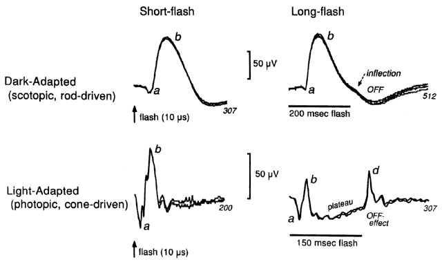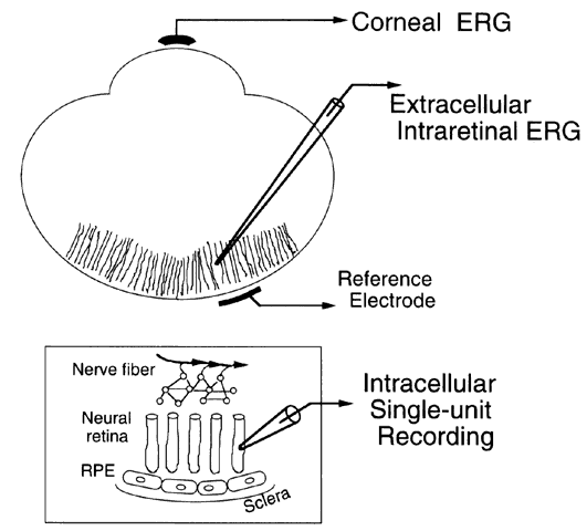 RECORDING CONFIGURATIONS Intracellular Recordings To perform intracellular recordings, individual retinal neurons are impaled with a microelectrode that penetrates the retina (Fig. 4). One can record directly from these neurons, and then afterward identify the specific cell for histologic study by injecting dye through the microelectrode that impales the cell. Although intracellular recordings give detailed information about individual neurons, this technique does not elucidate the bigger picture of how individual neurons interact and how they contribute in aggregate to the complex spatial properties of vision. If two or more neurons are impaled simultaneously, each with separate microelectrodes, the input-output relationship of a pair of cells can be studied. By this approach, the light response of a bipolar cell can be studied while simultaneously recording from the rod or cone photoreceptor cell that drives the response. Double electrode recordings are important for deducing the transmission properties of the synapses that connect different cells, such as between photoreceptor and bipolar cells. Recently, multielectrode arrays have been etched onto microchips that are floated on the surface of the retina to record simultaneously from many adjacent ganglion cells. This has provided a wealth of information about spatial vision properties. Extracellular Intraretinal Recordings Extracellular recordings are used to study electrical activity within the retina, but outside the cell bodies. This technique is a bridge between intracellular recordings and corneal recordings. For intact eyes in vivo, an electrode can be advanced through the sclera and into the retina. When the microelectrode is placed adjacent to a ganglion cell, the rapid firing of an individual spike discharge is observed. If the electrode is advanced into the subretinal space adjacent to photoreceptor outer segments, the extracellular voltage resulting when rods and cones hyperpolarize upon stimulation by light can be observed. This approach provides a way to localize ERG components that arise from the different classes of neurons in the separate cellular layers of the retina. As an alternative, the eye can be removed and hemisected, and the neurosensory retina then can be gently lifted out, placed in a superfusion chamber, and maintained for extended periods of study via an extracellular electrode. Corneal Recordings Corneal recordings are used for the ERG. The ERG is the cumulative, total extracellular output of neural retinal signaling. The ERG provides a noninvasive way to record from human subjects. Historically, the ERG was the earliest method used to sample neural retinal signals. Although this technique has considerable power, it cannot provide detailed information about individual cells within the retina. Rather, it provides a picture of the aggregate of activity from the various retinal cellular layers and from classes of retinal neurons, such as all of the rods, or cones, or bipolar cells, or amacrine cells together. Understanding some of the ERG potentials provided the first insight into overall organization of the neural retina and resulted in a Nobel prize for Granit in 1967. His book is an ERG classic and well worth reading. These three recording configurations—intracellular, extracellular, and corneal ERG—provide complementary information. Although intracellular recordings can provide a detailed picture of the activity of individual neurons, it is difficult to build up a general overview of retinal activity only by observing one cell at a time. Extracellular recordings can sample the massed responses of many neurons simultaneously, such as the rod photoreceptors when recording in subretinal space; however, this technique is still invasive and consequently is not applicable for clinical studies. With noninvasive corneal ERG recordings, one can deduce which signals are from the photoreceptors, bipolar cells, or amacrine cells. Consequently, the ERG is invaluable for the clinical diagnosis of retinal disease. The ERG is limited, however, because signals from different cells frequently overlap in time and interfere with the observation of single cell types in isolation. ELECTRORETINOGRAM: FIELD POTENTIALS FROM THE RETINA The ERG represents the massed extracellular response of the retina (Fig. 5). The ERG can be recorded either (1) by inserting a microelectrode into the retina; or (2) by placing an electrode on the cornea, remote from the retina. When recorded with a corneal electrode, the ERG provides an important noninvasive tool of considerable power for diagnostic assessment of retinal disease. Signals from many different classes of retinal cells can be observed by the ERG, including responses of the RPE, rod photoreceptors, cone photoreceptors, DBCs and HBCs, and some types of amacrine cells. The main limitation of ERG analysis involves the difficulty of isolating the contribution from a single class of neurons, since the individual contributions overlap each other and sum together into a single complex waveform. Despite this long and venerable history of ERG studies extending back for many decades, major new advances continue to occur in understanding the origins of ERG waves, and new components of the ERG continue to be identified. One strategy for separating the many different ERG components lies in manipulating the stimulus conditions, including stimulus of color, flicker rate, intensity, duration, and background adaptation. With dim flashes in complete darkness, the ERG originates from the rod system. Rod responses are suppressed by light adaptation, and recording in the presence of a constant bright background will elicit ERG responses exclusively from the cone system. Blue stimuli favor rod responses, whereas longer wavelength red stimuli favor the cone system. Rapid flicker elicits primarily cone system activity, since rod photoreceptors cannot respond to flicker much above 10 to 20 Hz. For higher 