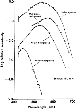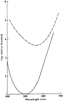 is near 555 nm (Fig. 3). Under dark-adapted conditions rods are about 1,000-fold more sensitive