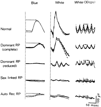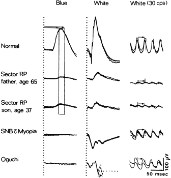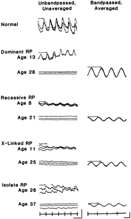 retain 20/20 vision and have a profoundly reduced full-field ERG.5,14 A patient with a macular and perimacular scar would be expected to have a reduction in the full-field cone and rod ERG, taking into account the fact that large numbers of cones and rods are normally located in the macular and perimacular zone. A patient with a large peripheral chorioretinal scar would also be expected to have a reduction in the full-field rod and cone ERG because of loss of rod and cone function in the peripheral retina. Patients with losses of patches of retina characteristically show reductions in amplitude with normal b-wave implicit times (i.e., time intervals between stimulus onset and major cornea-positive peaks of the rod or cone responses).15 In the ERG, the initial cornea-negative component (i.e., negative relative to baseline) or a-wave is generated by the photoreceptors, whereas the later cornea-positive component or b-wave is generated by cells proximal to the photoreceptors. A patient with a central retinal artery occlusion would be expected to have a preserved a-wave and loss of the b-wave. Patients with reduced vision due to optic atrophy or cortical disease and preserved outer retinal function would be expected to have normal ERGs to full-field flashes of light.5 Rod responses are conventionally separated with dim blue light, whereas cone responses are isolated with a flickering light at 30 cycles per second (e.g., 30 Hz). Representative full-field ERGs are illustrated in Figure 5 from a normal subject and four children, ages 9 to 14, with early RP. Rod responses to dim blue light under dark-adapted conditions (left column) are reduced in all genetic types and, when detectable, are delayed in b-wave implicit times, as designated by horizontal arrows. Cone responses to 30-cycles-per-second white flickering light (right column) are normal or reduced in amplitude and normal or delayed in b-wave implicit times. In the dominant with reduced penetrance, X-linked, and autosomal recessive forms of RP, cone b-wave implicit times, displayed by arrows in the right column, are so delayed that a phase shift occurs between the stimulus artifacts (designated by the vertical lines) and the corresponding response peaks; each stimulus flash elicits the next-plus-one response in contrast to the normal. In the mixed cone-rod responses to single flashes of white light under dark-adapted conditions (middle column), the cornea-negative a-wave generated by the photoreceptors is reduced in amplitude in all genetic types, pointing to the involvement of the photoreceptors in these early stages.16 The subnormal responses with delayed b-wave implicit times seen in the widespread progressive forms of RP contrast with the subnormal responses with normal b-wave implicit times seen in self-limited sector RP (Fig. 6). For example, a father and son with dominantly inherited sector RP, separated in age by almost 30 years, have comparably reduced amplitudes and normal b-wave implicit times. These patients usually have an area of intra-retinal pigment confined to one or two quadrants of the periphery of each eye with loss of peripheral rods and cones with consequent reductions in both rod and cone amplitudes. Rod b-wave implicit times are within the normal range (designated by the vertical bars), and cone b-wave implicit times are also within the normal range, as each stimulus elicits the succeeding response as seen in the normals. The focal loss of retinal function seen in sector RP is comparable to that recorded from a patient with a large peripheral chorioretinal scar.15,16 In Figure 6 ERGs are also illustrated from a patient with stationary night blindness with myopia with a defect in intraretinal rod transmission and from a patient with Oguchi's disease with a defect in rod neural adaptation to show that forms ofstationary night blindness also have normal coneb-wave implicit times. These ERGs in patients with stationary night blindness are contrasted with the delays in b-wave implicit time seen in patients with progressive forms of night blindness associated with RP (see Fig. 5). Therefore, the full-field ERG can be used as an aid in defining the type and extent of rod and cone involvement and the long-term prognosis in some patients with hereditary retinal diseases.16 Full-field ERGs can be used not only to detect which patients are affected with the early stages of RP but also to determine which relatives are normal. In families with RP, patients age 6 and older with normal full-field ERGs with normal cone and rod amplitudes and normal cone and rod b-wave implicit times have not been observed to develop RP at a later time.16 Computer averaging and narrow bandpass filtering have extended the range of detectability of ERG responses 100- to 1,000-fold. Responses that were undetectable without computer averaging or narrow bandpass filtering (i.e., < 10 μV) can be monitored down to a level of 0.05 μV with these techniques. More than 90% of patients age 6 to 49 with RP with visual field diameters greater than 8 degrees have detectable ERG responses with computer averaging and narrow bandpass filtering, thereby making it possible to quantify the amount of remaining visual function and follow the course of their condition (Fig. 7).17,18 The computer-averaged ERG was used as the main outcome measure in a randomized, controlled, double-masked trial among 601 adults from 1984 to 1991 to determine whether vitamin A or vitamin E, alone or in combination, would halt or slow the progression of the common forms of RP.19 Mean annual rates of decline of remaining ERG amplitude were slowest for the group taking 15,000 IU per day of vitamin A and fastest for the group taking 400 IU per day of vitamin E. A beneficial effect of vitamin A on preserving visual field area was also observed among a subset of 125 patients who could perform visual field testing with great precision.20 Based on these results, it has been recommended that most 