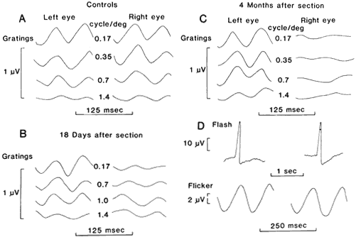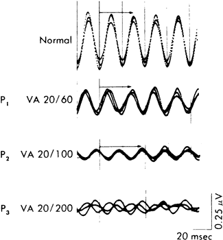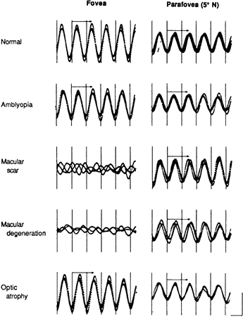 optic atrophy would be expected to have a normal foveal ERG (Fig. 8).23 Foveal cone ERGs elicited with a stimulator ophthalmoscope are illustrated in Figure 9 for a normal subject and for three patients with juvenile hereditary macular degeneration with visual acuities ranging from 20/60 to 20/200. These patients had normal full-field cone flicker responses (i.e., >50 μV), but foveal cone ERGs were reduced in amplitude (i.e., < 0.18 μV in this test system) without (patient 1) or with (patient 2) delays (i.e., >38 ms) in implicit times, or indistinguishable from noise (patient 3).22 These foveal ERGs are quantitated with computer averaging and narrow bandpass filtering, thereby permitting detection of these small responses. Focal cone ERGs have proved useful in detecting and quantitating macular cone malfunction in patients with early stages of juvenile recessively inherited macular degeneration with visual acuity reduced to 20/50 or below. Patients with visual acuity less than 20/100 have had smaller and slower foveal cone ERGs than those with better visual acuity.24 Responses from the central retina can be elicited not only in response to flashes of light but also in response to a phase reversing pattern stimulus, usually a grating or checkerboard displayed on a television screen. The pattern elements (checks or bars) periodically reverse position, so that the bright bars become dim and vice versa, although the sum of all bars has a constant brightness at all times. The responses can be reliably assessed only when the stimulus is known to be focused on the retina and to be stable on the fovea during testing. In contrast to the flash ERG, it has been reported that the pattern ERG can be eliminated by transection of the optic nerve (Fig. 10), supporting the idea that the pattern response is generated by the inner retina.25 However, there is some question as to whether the entire response is produced by ganglion cells, as the pattern ERG from a patient with surgical resection of the optic nerve showed a small residual response 30 months after surgery.26 The pattern ERG may have clinical value in monitoring inner retinal diseases such as glaucoma or optic nerve abnormalities, but an abnormal pattern response should be interpreted as reflecting inner retinal or optic nerve disease only when it is known that the outer retina is functionally intact, as abnormal pattern ERGs have also been reported in macular degenerations involving the photoreceptors.27 |