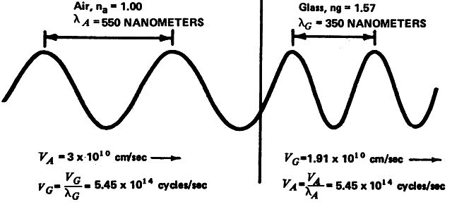 Visible light has three important characteristics, one of which is wavelength. This is the distance between any two similar given points on a single wave of light. It is usually recorded as the distance from one crest to the next adjoining crest (see Fig. 2). Wavelength is abbreviated lambda (λ), and of all the physical dimensions it is the most important in determining the color of light. Another important characteristic is the speed of light, which was discussed earlier. The third is frequency, which is usually abbreviated V and is the number of complete cycles moving past a specific point over a given period of time. Velocity, wavelength, and frequency are related in the following manner (equation 1): Velocity (V) = wavelength (λ) × frequency (ν) Frequency is a constant, and consequently wavelength and velocity are reciprocally related. If velocity decreases as a ray of light passes through crown glass, then the wavelength must shorten so that the frequency will remain constant (Fig. 3). The speed of light can be measured in a variety of ways. One simple and direct method of such a measurement is the use of mirrors rotating at a (known speed and separated by a known distance. Wavelength can be measured by an interferometer. This somewhat cumbersome and delicate laboratory instrument uses an interference grating and will measure exactly the wavelength of any given test light. If the wavelength and velocity are known, the frequency is easily calculated from equation 1. The exact nature of light is still unknown, although a number of theories that have been deduced from the physical behavior of light are useful for descriptive purposes. The foremost theories are those of Newton and Huygens. Newton in 1672 held that light is a particle or corpuscle that travels in a straight line from its source to the eye or from its source to an object, where it is then reflected into the eye. Newton's concept of light is still quite useful today when an attempt is made to describe the physical effects of light that result in transformation of the energy contained in the light ray. An example of this energy transformation is light falling on photographic film or the photochemical effect of light on the retinal pigments or on the basal cells of the skin. The toxic effects of light and its carcinogenic properties are also best explained in terms of particles impacting on a molecule and producing a chemical change therein. Such energy transformation can be considered in terms of light as a nonmaterial particle of minimal energy, a single unit of which is termed a photon or quantum. These terms were coined by Planck, who believed that light energy was released and absorbed in discrete quanta or photons. The retinal photoreceptors do seem to behave as true quantum detectors rather than as simple energy detectors, in that a single quantum of light absorbed by one molecule of retinal pigment located in a photoreceptor outer segment containing some 2 × 108 other unaffected molecules is a sufficient stimulus to activate the receptor.2 The energy for a given quantum of light is least for the longest wavelengths and greatest for the shortest (see Fig. 1). Therefore, the energy contained in a given number of quanta is directly proportional to their frequency and inversely proportional to their wavelength. The energy (E) so contained can be calculated by the following formula (equation 2): E = h·ν where h is Planck's constant 6.6256 × 10-27 joule-seconds, and ν is the frequency in hertz. The amount of available energy from the short violet end of the spectrum is about twice that from the longer red end (see Fig. 1). This is an important consideration when determining the heat-generating properties of light. When considering stimulation of the retinal photoreceptors, the total energy present in any given quantum of light is unimportant. The critical factor is the wavelength of the incident light and the ability of the photopigment to absorb it. If a specific wavelength of light can be absorbed by photopigment, the resultant reactions will be of the same magnitude regardless of whether the wavelength is long or short. Generally, Newton's concept (with Planck's modification) of light as a particle or corpuscle is most useful in describing the events that occur in photochemical reactions, photoelectric cell function, and other light-induced chemical or physical reactions. The wave theory suggested by Huygens in 1678 states that light is generated by molecular vibrations in a luminous material and that these vibrations are transmitted through a transparent medium as waves whose movements are perpendicular to the direction of propagation. Maxwell in 1865 proposed that such wave motion is electromagnetic in nature and that light is similar in nature to all other electromagnetic energy forms that can be transmitted through a vacuum.3 The wave theory is most useful in describing the behavior of light passing through gratings or other small openings and thereby generating interference phenomena. It is also useful in describing the refraction of light by media of varying optical densities, including optical lenses, the cornea, and the lens of the eye. As noted previously, Snell was the first to describe the behavior of a ray of light passing from a medium of one optical density into or through a medium of dissimilar optical density. Snell's description of the behavior of light under these conditions is known as Snell's law or the refraction law. It states that the ratio of the sine of the angle of incidence to the sine of the angle of refraction of a ray of light is equal to the ratio of the velocity in the first medium to the velocity in the second medium. The refractive index of any given optical medium is the ratio of the speed of light in a vacuum to the speed of light in the material in question. Using the refractive index in Snell's equation rather than the velocity greatly simplifies the resulting calculation (