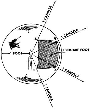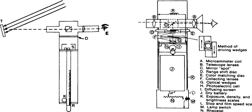 surface varies directly with the cosine of the angle of the incidence ( E = I cosine θ Both of these important concepts can be combined in a single formula (equation 6): Photometers are instruments designed to measure visible light. They generally fall into two major categories: subjective instruments in which the human eye acts as the receptive and quantitative element, and photoelectric (objective) instruments in which light activates a photoelectric system that then generates an electric current that may be measured on a meter calibrated in various scale units. Among the former instruments are the Macbeth illuminometer and S.E.I. (Salford Electric Instruments) photometer (Fig. 5). The Macbeth illuminometer uses the inverse square law, in that both the standard light and the light to be tested are observed through the instrument with a sharp border between the two. The standard light is then moved closer or farther away from the screen until the brightness of the two lights balance. This comparison-matching scheme is known as minimum border contrast matching. A reading is then taken from a graduated scale that is part of the instrument housing. The S.E.I. photometer uses two neutral density wedges that are moved over or away from the standard light source by a vernier system to balance the standard and test lights (see Fig. 5). Other types of visual photometers include the Bunsen “grease spot” photometer, in which the screen is a spot of translucent paraffin. The Luckiesch-Taylor photometer uses a standard that is balanced against the test field by rotating a disk of increasing neutral optical density. The Lummer-Brodhun photometer uses an internal projection system in which the test and standard are projected onto a white opaque screen and the illumination of the standard source is adjusted until the border between the two disappears, again using subjective minimum border contrast matching as the end point. Photoelectric photometers have largely replaced these older visual photometers. These newer instruments are simple to operate and convenient to use. They eliminate individual observer bias and variations among observers. Two major types are available. Photovoltaic cell meters operate from a photocell that directly converts incident light into an electric current that then operates a microammeter or galvanometer. The instrument can be calibrated directly in foot-candles or other units. Photoemissive or photoelectric meters also operate by use of a light-emittive photocell; however, power, instead of being generated by the photocell, is supplied by a battery or other external power source. Calibration can be in direct units such as foot-candles or other units as desired. If such photoelectric instruments are used to measure light needed for various visual tasks and applications, then the spectral sensitivity of the instrument must closely match that of the photopic human retina. Some of these devices can also be used in low-light ranges that would be appropriate for scotopic vision. Here, a filter must be placed over the window through which light enters the instrument to shift the spectrum appropriately toward the shorter wavelengths, to more nearly match the scotopic light sensitivity with that of the human retina. Most common light sources are supplied with a rating of the power consumed and not the amount of light produced: for example, a 25-watt incandescent light bulb or a 40-watt fluorescent tube. Large industrial lamps such as those used in search lights, flood lights, and airway beacons are often rated as to both the power consumed in watts and the light produced, usually expressed as candle power. The amount of light produced is difficult to relate directly to the power consumed because various sources have different degrees of efficiency: for example, an incandescent bulb is much less efficient in producing visible light than a fluorescent tube per watt of power expended. A number of units are available to describe and quantify visible light illuminance. Some of these units, such as the foot-candle, are self-explanatory, whereas others, such as the nit, offer no clue as to their derivation or possible application (Table 3).