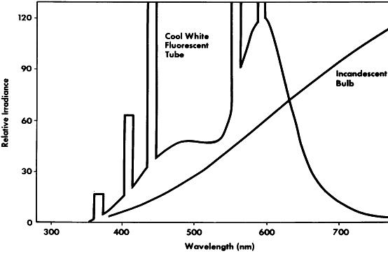 NATURAL LIGHT SOURCES Sunlight is the most abundant source of natural illumination. Approximately 75% of the energy present in incident sunlight reaches the earth's surface. On a clear day, sunlight can illuminate the earth's surface in excess of 10,000 foot-candles. On overcast days, this may drop to 1000 foot-candles. The spectrum of sunlight at the earth's surface and that for photopic vision are shown in Figure 9. Atmospheric water vapor, ozone, dust, smoke, and other air impurities tend to absorb and reflect many of the shorter wavelengths. Trees, buildings, hills, cliffs, and other tall objects cast shadows, and these shadows are commonly termed shade. The illumination present in a shady area on a bright day is roughly comparable to that found on a cloudy day when there are no visible shadows, a value of approximately 1000 foot-candles.7 Skylight is the sun's irradiation reaching the earth's surface that has been scattered by the atmosphere. Much of this scattering is due to the molecules that make up air, and the size of these molecules is quite small relative to the wavelengths of the scattered light. Such scattering varies inversely as the fourth power of the wavelength, and this results in the blue color of the clear sky and the red color of the sun when it is low on the horizon. Light scattering by larger molecules such as water vapor is about equal for all wavelengths of light; therefore, clouds, steam, and mist appear white. Moonlight is reflected sunlight reaching the earth from the moon's surface. The moon is an inefficient reflector for the sun, and the brightest illumination at the earth's surface from incident moonlight is only approximately 0.04 foot-candles. A small personal dosimeter with the detector head mounted on the bow of eyeglass frames has been developed. It measures visible light as well as ultraviolet B.8 ARTIFICIAL LIGHT SOURCES Manmade light sources include hundreds of light-emitting systems ranging from a candle flame to gas-discharge tubes, lasers, and a host of other sources. A complete discussion of these artificial sources is beyond the scope of this chapter, but several common lighting systems are of interest to the clinician. Incandescent filament lights, light bulbs, are a universal source of artificial illumination. They function by passing an electric current through a filament. The current heats the filament to approximately 600°C, thereby producing visible light. The filament in most incandescent bulbs is tungsten, and the radiation characteristics of this element are shown in Figure 7. Fluorescent lights are usually shaped as a tube and can be straight or bent into circular or other configurations. These are electron-discharge sources, in which electrons are passed through a vapor of mercury or some other element, resulting in nonvisible ultraviolet irradiation. This irradiation strikes a phosphor coated on the inside of the tube, which is then activated to produce visible light. The color of the light depends on the blend of chemicals making up the phosphor. A wide variety of emitted light colors are available, ranging from blue and standard white to warm white, pink, and red. The spectral emission for a cool white fluorescent tube is shown in Figure 7. Fluorescent tubes are much more efficient than tungsten filament bulbs in the production of visible light per watt of power applied. Light-emitting diodes are used to form numbers or letters or to signal that an action is about to take place or has taken place. These are formed of pure semiconductor material containing at least two controlled impurities, one of which has an excess of electrons and the other of which has a shortage of electrons. When a direct current is passed through the system, electrons meet at the junction of the two impurities, where they combine, thereby emitting photons of visible light. Light-emitting diodes usually contain gallium phosphide, which produces red light, whereas those made of silicon carbide emit yellow light. The output of visible light is usually quite low, around 0.015 candela; however, this is ample to provide a lighted letter or number that is bright enough to be easily seen even in a brightly lighted room or in a sunlit environment such as the cockpit of an airplane flying at high altitude on a bright day. The light value is low enough that it can still be easily read in a dark environment, such as a darkened examination room, without dazzling the observer. Satisfactory indoor illumination for most visual needs ranges from 50 to 100 foot-candles. This is only approximately 10% of the illumination present in the shade of a tree on a bright, clear day.7 |