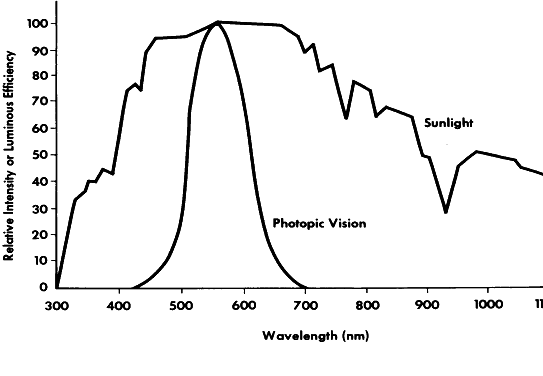 For practical everyday purposes in any given illuminated environment, the difference between the highest and the lowest illumination should not be more than 0.3. Lights should be placed at least 20° above the line of vision and often are best placed behind and also to each side of the worker. Because freedom from shadows is often an important consideration, several moderately bright sources of light are much better than a single brilliant source. This is easily tested by holding a pencil 10 cm above the work space. If a distinct shadow forms, the light source is not diffuse enough. Light placement should be such that no direct specular reflections strike the eye. This can be easily tested by placing a mirror on the work area. Of interest to clinical practitioners is the spectral quality, the color, and the intensity of the light needed to adequately and comfortably carry out specific tasks. LUMINOUS EFFICIENCY The maximal sensitivity of the light-adapted (photopic) human eye is at approximately 550 nm (Fig. 8). Light at this wavelength is yellow green and is most efficient in stimulating the retinal cones. The efficiency of light as a photopic retinal stimulus decreases rapidly as one moves toward the shorter or longer wavelengths. In the dark-adapted (scotopic) eye, the peak of the sensitivity curve is shifted to shorter wavelengths, reaching its maximum at 507 nm (see Fig. 8). Cones are not stimulated by low light levels that stimulate the rods during scotopic vision. Rods are relatively insensitive to longer wavelengths of light toward the red end of the spectrum. Therefore, red goggles can be used to carry out photopic activities while allowing the retina simultaneously to undergo scotopic adaptation. Such adaptation goggles are often used by radiologists, fluoroscopists, and others who must do their work under scotopic conditions.