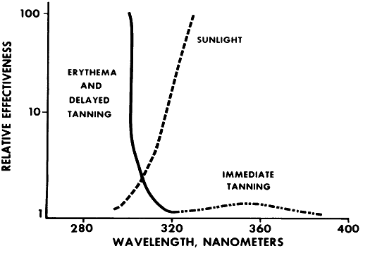 is discussed under the somewhat narrower heading of light toxicity. With a few important exceptions, the sun is the only light source that is intense enough at certain specific wavelengths to produce toxic effects on the eye or the skin of exposed body areas. Approximately 25% of the total solar energy reaching the earth has a wavelength longer than 1000 nm. The peak at sea level is approximately 550 nm, and much of the remaining energy is concentrated toward the blue end of the spectrum (see Fig. 9). Generally, indoor illumination is in the range of 50 to 100 foot-candles, or approximately 10% of the light normally available outdoors in the shade of a tree on a bright, sunny day. Therefore, normal light found in working areas, homes, and stores does not have the intensity to produce detectable biologic effects. Artificial light sources that can be dangerous include those radiating light near the short end of the spectrum, such as welding arcs, electric arcs, and light from damaged mercury vapor lamps. One of the most common manifestations of light toxicity is sunburn, which is caused by ultraviolet wavelengths ranging from 290 to 320 nm with a peak at 297 nm (Fig. 13). Much of this irradiation is filtered out by ordinary window glass but not by plastic. Exposure of the skin to light of this spectral character results in blockage of DNA synthesis due to thymine dimer formation, which inhibits DNA polymerase activity.18 RNA and other protein synthesis may also be blocked.19,20 Such short wavelengths of sunlight reaching the dermal melanocytes increase the secretion and movement of melanoprotein into the dendritic processes of the cells, which extend upward into the prickle cell layer. One melanocyte generally supplies approximately 36 prickle cells, forming one epidermal melanin unit. The basic number of melanocytes is the same in all races; however, melanin production is more active in dark-complected people. In the untanned state, basic skin color is determined by genetic mechanisms. A few hours after exposure to short wavelengths of light, the skin becomes erythematous. Such reddening may last from a few hours to several days. If severe, it is often accompanied by moderate discomfort. The erythema is due to dilation of capillaries in the dermis. A person can lose significant body heat through these dilated vessels if a considerable area is involved. As the erythema fades, melanin production increases, with melanin being secreted into the basal dermal cells. Further exposure to sunlight brings about an immediate darkening due to increased melanin secretion within 1 to 4 hours, which is followed by a more permanent tanning that will last a period of several weeks. As the basal epithelial cells containing the melanin granules move toward the surface, they are eventually shed; therefore, tan fades in the winter. The exact stimulus for melanin formation and secretion, as well as capillary dilation, is unknown. It has been suggested that this may be a direct effect of short wavelength light on the melanocytes and the capillary walls or the secretion of a locally acting substance by the basal epithelial cells.