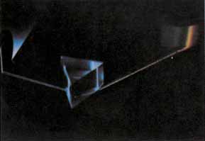 Light also has particle properties and wave characteristics; the radiant energy can be considered as extremely small discontinuous particles of energy called quanta. The energy in a quantum is directly proportional to the frequency of the electromagnetic energy. Consequently, high-frequency violet light (400 nm) contains twice the energy per quantum as radiation at 800 nm. In 1666 Isaac Newton spread the spectral components of normal white sunlight across the wall of his room by allowing a shaft of white light to pass through a small glass prism. A repetition of this simple experiment will illustrate a number of important aspects of color vision to be considered in some detail later in this chapter (Fig. 2, in color). If your vision is normal, you will note first that the ends of such a spectrum (violet and red) are quite dim compared with the middle of the spectrum (yellow and green). The fact that the middle appears to be the brightest suggests that the eye is not equally sensitive to all wavelengths. Second, as you move your eyes across the color spectrum, you will find two areas in which, for a given space (or number of nanometers), you seem to perceive more than the usual number of different colors. One of these areas is in the blue and green region; the other in the yellow region. This phenomenon suggests that the eye is able to make finer discrimination between adjacent wavelengths in certain sections of the spectrum. Third, you will probably find that the region of the spectrum that looks the least colored or most like white lies in the yellow portion of the spectrum (approximately 570 nm).