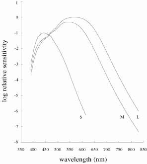 PHOTOPIGMENTS The first steps of vision involve the absorption of quanta by bleachable photopigments. The photopigments are located in the outer segments of either rod or cone photoreceptors in the retina. The pigments in the cones are important for color vision. Each pigment molecule consists of a protein part, the opsin, and 11-cis retinal, a chromophore. Once the chromophore absorbs a quantum, it changes to the all-trans form. This then causes a shape change in the visual pigment molecule, which activates the pigment and initiates the phototransduction cascade, which eventually leads to the generation of visual signals that leave the eye. Whether a quantum is absorbed by a pigment, or whether the quantum retains its energy and is simply transmitted through the cone, depends on the wavelength of the quantum and on the spectral tuning property of the pigment molecule. Human color vision can be approached by considering the three major classes of cones, designated S, M, and L. The letters are abbreviations for short wavelength-sensitive (S), medium wavelength-sensitive (M), and long wavelength-sensitive (L). The cone types refer to the broad regions of the spectrum over which each pigment absorbs. It is important to observe that the classical designations of blue, green, and red cones are no longer used because they are misleading. Although recent studies have shown that there are multiple variations within the L and M families of pigments within the color normal retina, it is still useful to consider color vision from the point of view of prototypical S, M, and L pigments. Measurements of human M and L cone pigments are shown in Figure 3. Individual cone outer segments were sucked into a suction micropipette recording electrode. The electrode records the circulating photocurrent in the outer segments of individual photoreceptors.6 At each wavelength across the spectrum, the amount of energy is found that gives a criterion electrical response. To plot the spectral sensitivity of each cone, the inverse of this energy is plotted against wavelength. Figure 3 shows that both L and M pigments are sensitive to a broad range of wavelengths. They are certainly not sensitive to only the parts of the spectrum that we would name as red and green. The wavelengths of peak absorption of the L and M pigments are approximately 530 nm and 560 nm. The human S pigment (not shown) peaks at approximately 420 nm. In the living eye, the spectral tuning of the cones is further shaped by the spectral absorption of the ocular media through which light must pass before reaching the retina. The principal structures that reduce sensitivity are the crystalline lens and the macular pigment (for foveal vision). The lens absorbs strongly in the UVA region, and it ultimately limits visibility at short wavelengths. As we age, the crystalline lens absorbs more and more short wavelength light and it acts as a yellow filter. Note in Figure 3 that the cone pigments themselves are quite sensitive at short wavelengths. The macular pigment, composed of lutein and zeaxanthin, is present in the central 5 degrees of the retina and it has a peak absorption at 460 nm.7 Macular pigment absorbs very little light at wavelengths shorter than 400 nm or longer than 520 nm, hence it too appears yellow (giving the macula lutea its name). Figure 4 shows the best estimates of the human cone spectral sensitivities in the living eye.8,9 Average estimates for lens and macular pigment absorptions have been used. To generate a set of so-called fundamental curves such as these, a number of measurements are usually considered. Importantly, the proposed curves must be consistent with human color vision, particularly color-matching behavior (discussed later). In addition, the fundamentals should be consistent with physiological measurements such as suction electrode studies, microspectrophotometric estimates of human cones, and human dichromatic color vision. Note that the sensitivity to short wavelengths appears reduced compared to the pigment curves in Figure 3. As discussed previously, this is caused by the media absorption. The relative heights of the curves reflect the relative numbers of each cone type in the normal trichromatic eye.
