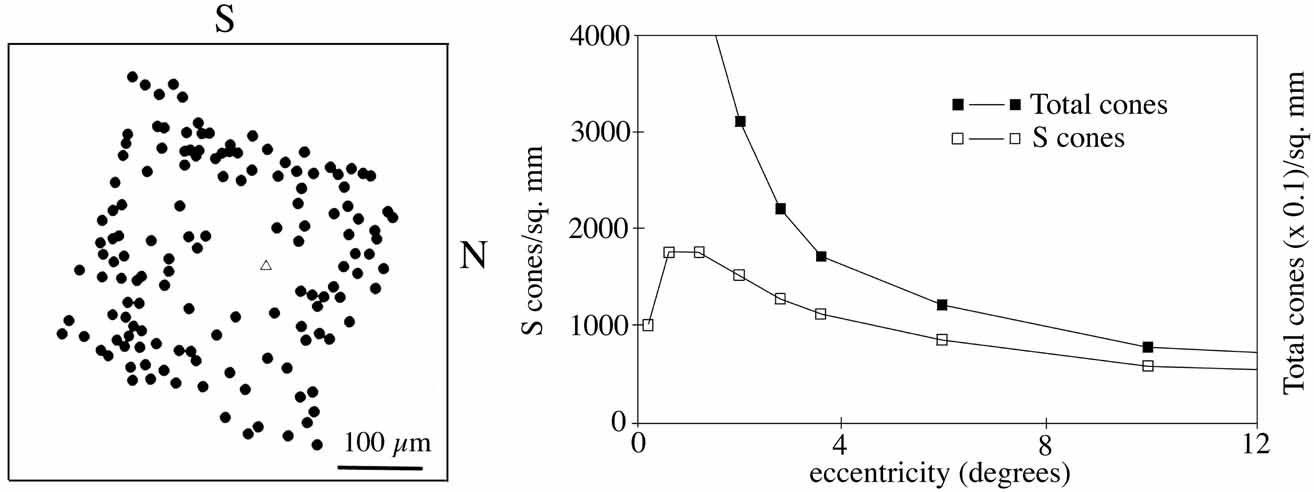 CONES AND CONE ARRAYS The principle of univariance states that information about a photon's energy or wavelength is lost once it is absorbed by a photopigment molecule.10 This crucial fact means that each cone is color blind. In other words, an individual cone can signal an increase or decrease in activity but it cannot distinguish whether the change in activity results from a wavelength shift or an intensity change. How then can an array of color-blind receptors provide information about the wavelength content of a stimulus? The answer is that each of the three cone types has a different response to the stimulus because of its spectral sensitivity, and by comparing the outputs from different cone types, a second-order neuron can separate out a change in wavelength from a change in intensity. For example, at constant luminance, a wavelength shift from 500 nm (green) to 490 nm (blue) will increase stimulation of S cones while decreasing stimulation of M and L cones. If the S, M, and L signals are compared, the direction of the wavelength shift can be discerned. However, an intensity change of a 500 nm light will increase (or decrease) the stimulation of all three cone types. Therefore, comparing outputs from cones or arrays of cones is essential for color vision. M and L cones are morphologically indistinguishable, and they comprise more than 90% of all cones. S cones, however, tend to be fatter than the other cone types, particularly in the region of the inner segment, and they make up less than 10% of the 5 million cones in a human eye.11. There are approximately twice as many L cones as M cones, although individual variation occurs within the color normal population.12,13 Overall, the ratio of S:M:L is approximately 1:5:10. S cones are absent from the central 20 minutes of arc of the central foveola. This S–cone-free zone corresponds to the size of a 20/80 letter. The S cones do not contribute to detailed visual resolution, and their absence from this small central region allows optimal L and M cone packing, thereby maximizing spatial sampling.14 The consequence to color vision is that color normals are tritanopic for very small stimuli centered on the fovea. The density of S cones is greatest at 1 to 2 degrees from the fovea. Figure 5 shows the cone distributions and the S cone mosaic in a donor human eye. The density of L and M cones declines steeply away from the fovea. Although overall cone density is by far greatest at the fovea, cones are present across the entire retina. Recently adaptive optics has allowed direct visualization of the human cone mosaic. The technique compensates for aberrations of the eye, allowing previously unattainable spatial resolution. Combined with selective bleaching (using colored lights to differentially bleach cone populations) the mosaic of S, M, and L cones has been revealed.13 Figure 6a shows an image of the retina centered close to the fovea. Figure 6b shows a pseudo color image in which individual S, M, and L cones are colored blue, green, and red. Statistical analysis reveals that in humans S, M, and L cones appear randomly distributed 15.