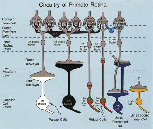 HORIZONTAL CELLS Horizontal cells are laterally connecting interneurons at the outer plexiform layer of the retina. They make synaptic connections with photoreceptors and bipolar cells. Two types of horizontal cell have been described in primate retina. H1 connects to L and M cones, but rarely S cones. H2 connects selectively to S cones and to L and M cones. Figure 7 shows a schematic of the circuitry in primate retina.16 Horizontal cells provide the lateral connections that create the center-surround receptive field (RF) structure of the bipolar cells. In lower vertebrates, for example fish, horizontal cells are chromatically opponent.17 This means that the horizontal cell hyperpolarizes to some wavelengths and depolarizes to other wavelengths. In contrast to this, intracellular recordings from primate retina clearly show that horizontal cells hyperpolarize to all wavelengths, and they therefore do not carry a chromatically opponent signal.18 No experiments have shown that H1 cells make cone-specific connections to just M cones or just L cones. H1 connections to L and M appear random, and this implies that the RF surround of midget bipolars should have a mixed L+M spectral response. BIPOLAR CELLS The bipolar cells convey signals from photoreceptors to the ganglion and amacrine cells. Primate bipolar cells provide the first stage of separation of signals into the PC (parvocellular), MC (magnocellular), and KC (koniocellular) pathways. The pathways are named after specific target layers of the lateral geniculate nuclei. The three pathways are largely parallel with different anatomical connections and functional properties. With regard to color vision, the PC pathway appears to carry the red–green opponent signal and the KC pathway appears to carry the blue–yellow opponent signal. The MC pathway carries the luminance, or chromatically nonopponent, signal and it is not considered to play a role in color processing (for a review, see reference #). Bipolar cells have a center-surround RF structure, with horizontal cells providing the connections by which the RF surround is constructed. There are three broad classes of primate bipolar cell. Diffuse bipolars synapse directly to multiple cones, and they feed to the chromatically nonopponent MC ganglion cells. Midget bipolars over much of the retina synapse directly to a single cone. This creates a “private line” from a single cone to a single midget bipolar to a single midget (PC) ganglion cell. Intracellular recording from a midget bipolar has shown strong red–green opponency.20 Therefore, midget bipolars have a RF center mechanism that has a spectral sensitivity of whatever single cone type feeds its center. The RF surround mechanism is expected to have a spectral sensitivity of L+M, because H1 cells connect to L and M indiscriminately, although experimental determination of this is still lacking. A third class of bipolar cell is the S-cone bipolar, 21 which makes selective connections to S cones. Bipolar connections are shown in Figure 7. Each foveal cone connects to at least four bipolar cells, an on diffuse, an off diffuse, an on midget, and an off midget (for a review see 22). The on varieties respond with depolarization to increases in quantal absorptions in the receptive field center, and the off varieties respond by hyperpolarizing to increases in quantal absorptions in the RF center. On and off cells synapse at different sublayers of the inner plexiform layer. AMACRINE CELLS There are at least 40 types of amacrine cells, and they modulate the signal transferred between the bipolar and ganglion cells. There is no evidence for cone specificity in amacrine cells, that is, amacrine cells that receive input from just one of the three cone types. In macaque retina, the most studied amacrine cells are AI spiking amacrine cells and AII amacrine cells. Both types receive input from L and M cones and they have a spectral sensitivity similar to the photopic luminosity curve.20 No amacrine cell has shown chromatic opponency and no amacrine cell has revealed a strong S-cone input. The role of amacrine cells in color vision is still unclear. GANGLION CELLS We know more about the properties of ganglion cells than about most other retinal cell types. Extracellular techniques can be used to record ganglion cells' action potentials. There are three major anatomical types of ganglion cell in primate retina, corresponding to the three bipolar types. Parasol ganglion cells project to the magnocellular layers of the LGN, and they are considered the anatomical substrate of the MC cells. These ganglion cells are spectrally nonopponent. Some properties of PC and MC ganglion cells are given in Table 1.