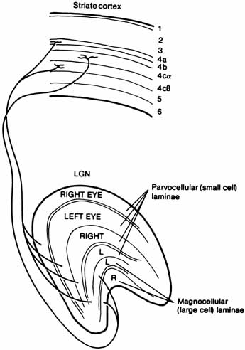 Midget ganglion cells project to the parvocellular layers of the LGN and they are considered to be the anatomical counterparts of PC cells (Fig. 7). These cells provide the substrate for red–green spectral opponency. In the central 10 degrees of the retina, each midget ganglion cell receives input from a single midget bipolar, which, in turn, receives input from a single L or M cone. The RF center is therefore cone-specific. Spectral opponency of the ganglion cell would ensure whether the RF surround, which is presumably established by outer retina circuitry,23 receives mixed inputs from L and M cones, or whether the surround somehow receives input from the single cone type that is not represented in the RF center. Whether the RF surround has a mixed L and M input or whether it receives input from a single cone type is an area of current debate.24,25 A third ganglion cell type, named small bistratified ganglion cells, underlies blue–yellow opponency. These cells have been recognized in macaque and human retinas.26 They receive a direct input from the S-cone bipolar at their innermost tier and input from an OFF bipolar cell at the outermost tier (Fig. 7). The OFF bipolar cell connects to L and M cones. Therefore, this cell type responds with an increased firing rate to blue increments of light filling the RF and by reduced firing to yellow increments (blue-ON-yellow-OFF). The center and surround of the RF are the same size, so this cell type shows no spatial opponency. More recently, newly identified small populations of ganglion cells have been shown to receive S-cone input.27 These ganglion cells may help to clarify the sources of the S-OFF signal and thereby help to complete the picture of retinal circuitry for the S-cone pathways. LATERAL GENICULATE NUCLEUS Ganglion cells project to one of the two lateral geniculate nuclei, where they synapse. Each LGN is a 12-layered structure with four layers of small cells (parvolayers) and two layers of large cells (magnolayers). Each of the six layers has a sublayer of cells called the koniocellular layer (Fig. 8). This anatomical arrangement reveals a corresponding functional separation. Magnocellular LGN Parasol retinal ganglion cells project to the MC layers of the LGN. Magnocells are spatially opponent but show no spectral opponency. Most of the cone input to these cells comes from L and M cones, although S cones do appear to contribute to both the receptive field center and surround.19 The spectral sensitivity of MC layers approximates the photopic luminosity function. Koniocellular LGN Small bistratified ganglion cells (those serving the S cone pathways) synapse in the KC layers of the LGN. The KC path has blue–yellow spectral opponency but little or no spatial opponency. Parvocellular LGN Approximately 80% of ganglion cells project to the parvocellular layers of the LGN. PC LGN cells are spatially and spectrally opponent. Their spectral opponency comes from antagonistic L and M cone inputs to the center and surround of their receptive fields. Although these cells demonstrate strong color opponency, they also show spatial opponency to luminance stimuli, ie, stimuli that vary in intensity but not color.4 Therefore it is highly unlikely that these cells are devoted to color processing alone. The color responses of cells can be determined in a number of ways. A particularly useful characterization can be made by modulating a stimulus along different directions in color space and determining which color direction most excites a particular cell. The color space shown in Figure 21 (shown later) demonstrates this principle. The preferred color direction for a cell provides a signature, and it is possible to deduce from the signature which cone types input to a given cell.28 The LGN cells' preferred directions in color space cluster into three groups. In general, KC cells respond best to isoluminant stimuli that modulate the S cone signals. PC cells respond best to isoluminant stimuli that modulate L and M cones without a change in S-cone stimulation. And finally, MC cells respond best to luminance (brightness) modulations. Perceptually, humans can identify red, green, blue, and yellow colors that contain no trace of any other color. These are termed unique hues. A goal of the neurophysiology of color is to explain the cellular basis of color perception. The LGN PC pathway is the best candidate for red–green perceptual opponent color vision, and the KC pathway is the best candidate for blue–yellow perceptual opponency. However, the neurophysiological responses of both these pathways do not correlate well to our red–green and blue–yellow color vision. In other words, those stimuli that we perceive as unique hues do not correspond precisely to the preferred colors of the LGN MC and KC pathways. Therefore, we look to the visual cortex for another stage of color processing that might help explain the difference between the perceptual axes and the cells' signature axes. STRIATE CORTEX The destinations of the retinocortical pathways PC, MC, and KC, are separate in primary visual cortex, or V1. PC cells project to layers IVcβ, MC to IVcα, and KC to layers I and III. At this stage, the signals from these pathways become mixed with the result that V1 cells do not show the clustering of signature color responses into the discrete groups of LGN cells.29 Rather, optimum responses can be found to almost any direction in color space. The majority of V1 inputs come from color-coded cells, so it is not surprising that V1 cells show some color selectivity. However, it is not clear whether a given cell is coding color per se, or whether its color tuning is a byproduct of, for example, spatial processing. Cortical cells are found with color preferences that correspond to unique hues. Furthermore, cortical cells show responses that are more narrowly tuned to colors than LGN and ganglion cells, and the more precise tuning appears more consistent with pe