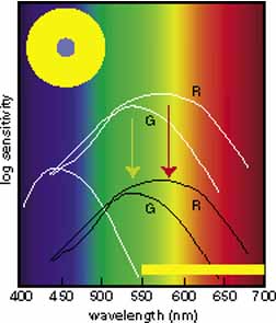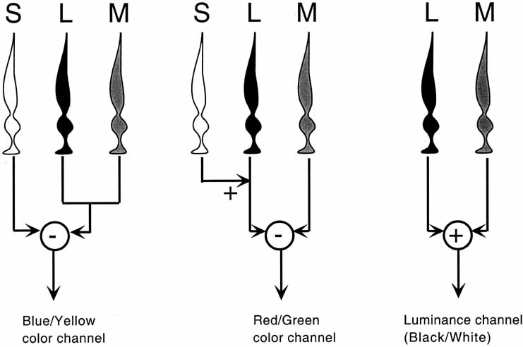 vision In the latter part of the nineteenth century, Ewald Hering proposed an opponent color theory to account for the appearance of colors.3 Hering observed that a colored light cannot simultaneously elicit the appearance of red and green. The same is true for blue and yellow. In some way, red and green are opposite (or opponent) hues and blue and yellow are opposite hues. This idea eventually led to models of color vision in which the three cone types constituted the first, trichromatic stage, as postulated by Young and Helmholtz, to account for color mixture data, and a second opponent-processing stage, postulated by Hering to account for the opponent appearance of colors. Such a two-stage model (or “zone model”) incorporating these two different lines of thinking about color vision, it was hoped, would account for more color vision data than either one alone. A simplified version of a zone model is shown in Figure 10. The model does not represent realistically the anatomical connections of the retina. The main features are the opposition (indicated by a minus sign) of S cone signals with a combination of L and M cone signals to generate a blue–yellow opponent channel, the opposition of L with M cone signals (with an input from S cones in the same direction as L signals) to generate the red–green opponent channel, and a luminance channel which sums (plus sign) the outputs of L and M cones. It is important to understand that the model is based on psychophysical evidence and the three identified channels are not necessarily identical to specific neural substrates. For example, luminance signals could be carried by different neural “streams” to the cortex and the stream responsible for color perception might change, depending on the spatial or temporal frequency of the visual stimuli or other stimulus factors. Similarly, the two color opponent channels of the model may share features with the responses of certain retinal ganglion cell types, but there are some important differences between color opponency in ganglion cells and perceptual opponency. HUE CANCELLATION EXPERIMENTS AND COLOR OPPONENCY More than 50 years after Hering put forward his ideas on opponent colors, Hurvich and Jameson measured the coloring power of spectral lights.48 They reasoned that if a light appeared red and there is a red–green color opponent channel, the redness could be canceled out by adding green to it. The amount of green required to neutralize the red would reflect the strength of the redness. By adding green light to red light, eventually a chromatic mixture could be made that contained neither redness nor greenness. The result would be a light that appeared unique yellow. Similarly, if there is a blue–yellow opponent channel, blue light could be used to cancel yellow and so on. Hurvich and Jameson determined hue cancellation functions for spectral lights of various wavelengths. The observer was provided with a 1-degree test stimulus consisting of a mixture of a monochromatic test wavelength and one of four fixed wavelength cancellation stimuli. The cancellation stimuli were close to the unique hues, red, green, blue, or yellow. For each test wavelength, the subject's task was to adjust the intensity of one of the cancellation stimuli until the target appeared to be neutral between blue and yellow (unique red or unique green), or neutral between red and green (unique yellow or unique blue). The resulting curves, shown in Figure 11, are called hue cancellation or chromatic valence functions. In the Figure, if the subject used blue to neutralize the yellowness in a test wavelength, the value is negative because it opposes the yellow value that is plotted as a positive value (subjects never tried to use both blue and yellow to neutralize). Similarly, the value of red used is plotted as positive and green is negative. This was for the convenience of visualizing the data. Notice from Figure 11 that short wavelength stimuli appear to have a significant amount of red because some of the green cancellation stimulus was needed to produce a non-colored appearance in the test patch. The unique hues (those hues that contain no trace of any other hue) can be found by locating the crossing points for each opponent mechanism. This is the point where the observer switched from adding green to adding red to neutralize, or switched from adding yellow to adding blue. The red–green mechanism has a zero value at approximately 475 nm (unique blue), and again at approximately 580 nm (unique yellow). The blue–yellow mechanism has a zero crossing at approximately 500 nm (unique green), and it approaches a second zero crossing at very long wavelengths. However, most observers agree that even very long wavelength lights appear to contain a little yellow, and unique red is therefore non-spectral, realized by adding unique blue to a long wavelength light. COLOR NAMING EXPERIMENTS AND COLOR OPPONENCY The original observation that colors appear in opposed pairs can be quantified using color naming studies. In a color naming experiment, an observer is presented with a spectral color and asked to name it using any combination of the terms red, green, yellow, and blue. Despite no restrictions being placed on which color names could be used together, observers rarely or never use red and green simultaneously or blue and yellow simultaneously. Thus, color-naming functions support the data from hue cancellation experiments. Interestingly, when the color of a small target presented in the visual periphery is assessed in this manner observers report that the color appears desaturated (pale or pastel) and of uncertain color.49 If the target size is increased however, a full range of peripheral hues is found, comparable to at the fovea. This suggests that peripheral color vision for large stimuli is similar to foveal color vision for small stimuli. |
