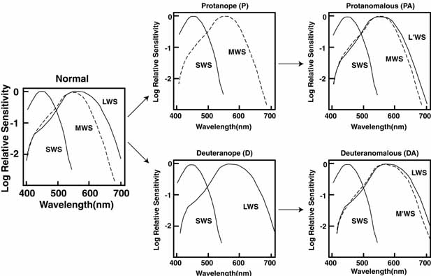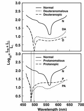 Dichromats have severe color defectiveness and are relatively common. Two percent of males and less than 0.02% of females can match all colors with a mixture of only two primary colors as a direct result of having only two functional cone photopigments. Protanopia (1% of males) and deuteranopia (1% of males) are the conditions in which the observer lacks the L or M cone pigment respectively. The genes controlling the structure and expression of the M and L photopigments are found on the X chromosome. The short wavelength sensitive (S) cone photopigment is controlled by a gene(s) on chromosome number 7. Tritanopia, the lack of functional S cones as an inherited condition, results from a small number of point mutations in the gene coding the S cone opsin. The defects follow a dominant inheritance pattern and the incidence is rare, estimated at 1 in 50,000 to 1 in 15,000. Anomalous trichromacy, with mild to medium color defectiveness, is the most common color defect. Approximately 6% of males and less than 0.4% of females are anomalous trichromats. They use different proportions of the three color primaries to match a colored test light. This is because one of their cone pigments has an abnormal spectral absorption. Figure 12 shows, schematically, the photopigments of the color defectives The first important studies of hereditary color-vision defects were by Seebek, who identified two forms of dichromacy, and Lord Rayleigh, who went further to identify two forms of anomalous trichromacy.52,53 The terms protanope and deuteranope were coined by Seebek in 1837 when he first distinguished between these two forms of dichromacy.52 The anomalous trichromats were identified by means of an instrument called the anomaloscope, which requires the subject to adjust a mixture of red and green light until it matches a standard yellow light. The anomalous trichromats differed from normal trichromats in requiring either more red (protanomalous) or more green (deuteranomalous) in the mixtures with which they matched the standard yellow light. This matching task administered by Rayleigh has become the basis of classifying hereditary red-green color defectives, and the anomaloscope is still considered the reference color-vision test against which newly devised tests are compared. |