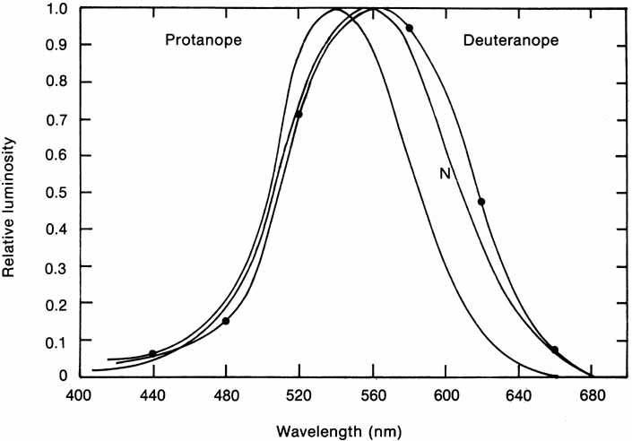 color defectives). HUE DISCRIMINATION There are two regions of the visible spectrum in which the ability to discriminate between adjacent wavelengths is at a maximum for normal eyes (Fig. 13). In these two regions, approximately 490 and 590 nm, there need be only a 1- or 2-nm difference between wavelengths for them to be seen as different! Wavelength discrimination (hue discrimination) is less acute in the middle of the spectrum and deteriorates rapidly at the ends of the spectrum. These measurements typically are made by comparing two adjacent patches of essentially monochromatic light (usually half fields of a circular patch) in which the two colors are carefully equated in brightness so that brightness differences do not form the basis of the discrimination. As Wright has pointed out, the curve has the characteristics that might have been anticipated from looking at the spectrum (as was demonstrated at the beginning of the chapter).54 The part of the spectrum in which maximum wavelength discrimination occurs is where the colors appear to be changing most rapidly. In the yellow region (590 nm), there is a rapid change to red on one side and green on the other; in the blue–green region (490 nm), there is a rapid change to blue on one side and green on the other. To distinguish lights that differ only in wavelength, the ratio of each of the cone receptor outputs must be compared for the two lights. One might consequently expect this ratio to be changing most rapidly in the spectral region in which the spectral sensitivity functions intersect or are changing most rapidly with respect to each other. As expected, “cross-points” are close to the spectral regions where the best hue discrimination occurs. In color-vision defectives who lack a cone pigments and therefore lack one of the crossing points, there is the expected loss of hue discrimination in that spectral region. Typical hue discrimination curves for severe color defectives are also shown in Figure 13. Notice that dichromatic wavelength discrimination is considerably worse than for normals and only approaches the normal value in the normal's blue–green (490 to 500nm) region of the spectrum. The red–green dichromat (protanope and deuteranope) is essentially a monochromat for wavelengths greater than 530 nm, which results in greens, yellow, oranges, and reds being indistinguishable in many situations. The anomalous trichromat, whether protanomalous or deuteranomalous has a similar but less severe deficiency in wavelength discrimination ability in the same region of the spectrum. The anomalous trichromat may have wavelength discrimination close to that of the dichromat (extreme anomaly) or almost identical with that of the normal eye (simple anomaly). These facts could have been predicted from the presumed physiology of the color defectives. Protanopes and deuteranopes appear to lack one of the three cone pigments—L and M, respectively. Consequently, for wavelengths greater than approximately 530 nm, there is only one cone photopigment being stimulated, leaving the dichromat in a monochromatic state for that region of the spectrum. The remaining cone pigments provide a basis for hue discrimination for wavelengths shorter than 530 nm. Anomalous trichromats probably have two of their three photopigments with peak wavelength sensitivities close together on the spectrum.55 The extreme anomal, whose color vision is similar to that of a dichromat, has two photopigments for the medium- and long-wavelength spectral regions whose peak sensitivities differ only by a few nanometers. Consequently, this will result in large portions of the spectrum producing similar ratios of stimulation for the two photopigments with an accompanying loss of wavelength discrimination. Although less well studied, the hue discrimination with tritan defects fits the predictions based on the absence or displacement of the S (blue) photopigment; short wavelength discrimination is poor, and the best wavelength discrimination is found at approximately 570nm. LUMINOSITY The lightness or brightness of a color depends largely on the relative luminous efficiency of the component wavelengths. Under daylight or photopic light conditions, a given brightness response is produced with the least amount of incident energy in the middle of the visible spectrum. A number of experiments have shown that the normal eye has a peak luminosity function at approximately 555 nm and that luminosity falls off toward the ends of the spectrum. Under scotopic or rod-dominated light conditions, the most luminous-efficient wavelengths are closer to 507 nm. The wavelength shift of maximum luminosity from photopic to scotopic viewing is the so-called Purkinje shift. Figure 14 shows the relative luminous efficiency for these two conditions. The curves form the basis of light units (photometric and scotometric, respectively) that are used internationally. The spectral luminosity function for color defectives can be compared with that for normals (Fig. 14). Some color defectives who lack the L cone photopigment (protanopes) or have it displaced in the spectrum (protanomalous trichromats) have an abnormal spectral luminosity function and consequently perceive long wavelengths as very dim, compared with the way they are perceived by the normal eye. Many find difficulty in seeing deep-red lights in some light-emitting diode displays of hand-held electronic calculators or in seeing brake lights on automobiles during daytime driving. Cole and Brown have shown that protanopes, because of this intensity loss, have longer reaction times than normal to red traffic signals.56 These individuals find the international system of specifying light units inappropriate. Different colored lights (e.g., red and green) specified as being of equal luminance (eg, 10 cd/m2 each) will have very different brightness to their eye. All other color defectives appear to have essentially normal luminosity, although there