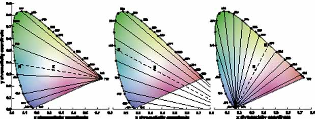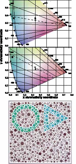 In specifying any other colors the relative amounts of these primaries (x, y) required to match a color can be used to generate a point in the two-dimensional x, y chromaticity plot (Fig. 18). Any color can be specified in this XYZ color space, and this notation is the most commonly adopted in describing conditions for experiments in color vision and identifying colors used in color vision testing procedures. It also finds wide application in industry and agriculture. A fundamental property of this space and of all color spaces is that the mixture of any two colors results in a color located in the color space somewhere along the line joining the two mixture colors. Similarly, a color resulting from the mixture of three colors will be found in the area bounded by the three colors. In that sense, the only colors available on a color TV or computer screen are those falling within the triangle formed in the color space by the locations of the colors of the three phosphors or primaries used to generate the colors. Because one set of color matching data from a set of primaries can be readily converted to the matches for another set of primaries as a result of observed laws of color additivity (Grassman's laws) there is considerable freedom in choosing a set of primaries for color specification. Of all the possible sets of color matching functions, there is one particular set that corresponds precisely to the spectral sensitivities of the three response systems in the eye that are responsible for trichromatic behavior. Therefore, it is convenient to think of color matching functions as being functionally equivalent to the spectral sensitivities of the cones, despite acknowledging that trichromacy in not necessarily imposed by three cone pigments. COLOR-DEFECTIVE VISION: DICHROMACY This consideration in the context of spectral sensitivities of the cones makes it easier to understand how the colors within the normal's color space collapse in a very predictable way for color defectives who behave as if they have only two of the three cone types (dichromats) and can match any color with just two color primaries. In any trichromatic color space, such as CIE XYZ, one can identify lines running through the color space along which colors appear identical for dichromats. These are called confusion lines. For color normals, colors continually change along these confusion lines entirely because of the changing absorption in just one of the three photopigments. The absorptions in the remaining two cone types are constant. If that one cone photopigment is missing, then there is no cue to the color changing along the line. Each of the 3 dichromat types has different confusion lines Confusion lines allow us to predict which colors will be indistinguishable from each other for a particular type of dichromat. See Figures 19 and 20. Consequently, the CIE chromaticity diagram with the appropriate confusion lines allows us to understand which colors are confused by dichromats. These confusion lines provide a rational basis for designing and interpreting clinical tests of color vision (see next section). With the advent of carefully controlled color presentations on computers it is possible to expand the kind of stimuli used in both clinical and research applications. Today researchers are able to stimulate different physiological important color pathways selectively and control the luminance of the stimuli while changing the shape and timing of stimuli quite precisely. This has significant implication for the clinical study of color vision in eye disease where we have already seen that color perception losses are often specific to the blue cones or to color pathways. A detailed example is shown in Figure 21. |