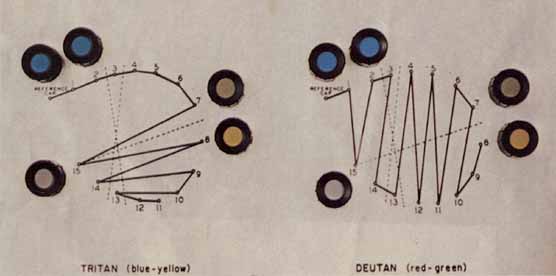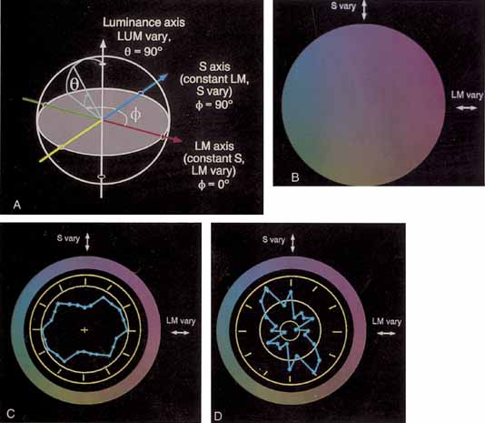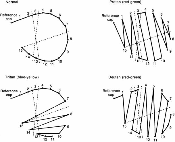 defect. BOOK TESTS Perhaps the most common form of test is the pseudoisochromatic plates. The Dvorine, Ishihara, AOC, AO H-R-R, and TMC plate tests are used most frequently in this country.79 All of these tests consist of plates made up of colored dots. In general, the colored dots are arranged so that to the normal eye the grouping of certain colors produces a figure. The figure usually is a number or a symbol, but in some of the tests (e.g., Ishihara and Dvorine) winding paths also are used for testing illiterates or children unfamiliar with letters. The dots of the figures and background cover a wide range of lightness values so that the recognition of the figure can be made only by color discrimination of either hue or saturation. Book or plate tests have been remarkably successful in detecting color defective vision. The colors of the figure and background are carefully chosen to lie close to confusion lines in color space. For example, many figures on the Ishihara Color Plate Test use a reddish, orange, and yellow dotted background within which is embedded a green number made up of dots with the same range brightness (so the number cannot be detected by brightness difference alone). Color defectives may be unable to discriminate the green number from the background because both color sets lay close to one of their confusion lines, and therefore the number is hidden. Ishihara book tests have one or more diagnostic plates on which the color normal sees both a red and a purple number on a gray background. These plates help distinguish protan from deutan observers. In the nonspectral purples, the dichromat has a zone that is indistinguishable from gray. A number of color-vision tests are designed to take advantage of the color defective's confusion of grays with purples and blue-greens. Figure 15 shows the small but significant difference in the most neutral spectral locus for the two red–green color defectives. This difference is enough to allow relatively clear distinction between protan and deutan defects in color-vision tests. ARRANGEMENT TESTS Two very useful tests are the Farnsworth-Munsell 100-hue test and the Farnsworth D-15 test. Both tests are made from colored papers in the Munsell color system. The Munsell colors are widely used as reference colors in industry and agriculture and the textile industry. It is arguably the most popular color specification system based, again, on three attributes—consistent with the trichromatic nature of normal color vision. The Munsell method of identifying colored surfaces (H V/C) locates a color in terms of three subjective attributes—hue (dominant spectral color), value (lightness), and chroma (lack of whiteness). All colors in the Munsell system are represented in a cylinder with 100 hues arranged and named around the circumference, with the lightest value at the top of the cylinder and the highest chroma on the outside of the cylinder (Fig. 22). These Munsell surface colors will appear to change with changes in the spectral energy distribution of the light source illuminating them; consequently, their location on the CIE diagram (chromaticity coordinates) has been specified with standard illuminants. The Munsell colored papers cover a wide range of colors and are widely used in medicine and industry. FARNSWORTH-MUNSELL 100-HUE TEST The 100-hue test consists of 85 colored papers, selected from the Munsell hue circle, mounted in plastic caps. The 85 different color caps are selected to represent equal steps of color difference around a complete color circle. The caps are divided into four groups. Each group is assigned to a separate tray representing a quadrant in the color circle. The test is designed as a hue discrimination test, so the caps differ only in hue, being of equal saturation and of more or less constant level of luminance. The subject is given one tray at a time and allowed 2 minutes with each tray to arrange the colors in serial order according to their hue; color defectives produce errors in characteristic sections of the color circle. The total number of errors and their position on the color circle suggest the diagnosis of the type of the defect and a measure of the severity. The 100-hue test is one of the few tests that allows the grading of the performance of normal color-vision patients into superior, moderate, and poor hue discrimination. Results of this test can be used in the same way as one might grade stereoscopic acuity among patients who have stereopsis. However, because of the time required to administer the test (15 to 20 minutes), it is unlikely to be of practical use for routine testing of color vision. FARNSWORTH D-15 TEST Perhaps the most clinically useful test is the Farnsworth Panel D-15 test (Figs. 23 and 24) and its related desaturated versions of the test. It was designed to dichotomize patients into those who are unlikely to experience difficulties with their color vision and those that are likely to have difficulties with colors. It is therefore a relatively easy test to pass for many anomalous trichromats but it will fail almost all dichromats (Fig. 25). In many respects it is a miniature version of the 100-hue test, consisting of 15 caps that form a color circle. As in the 100-hue test, the caps are to be arranged in serial order according to hue. However, it is different in principle in that it allows the patient the opportunity to confuse colors across quadrants of the color circle. For instance, reds can be confused with blue–greens. It is this feature that provides the diagnostic red–green and blue–yellow failures. In the more severe cases (dichromats), the arrangement of the caps is essentially along the confusion lines of color space discussed earlier in this chapter. A common clinical situation then is for a young male to fail the Ishihara plates but pass the D-15 arrangement test. This almost certainly indicates anomalous trichromacy, but without the axis of the errors on the D