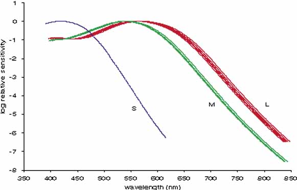 VARIATIONS IN X-LINKED PIGMENTS IN COLOR-NORMAL OBSERVERS The genes that code for L and M cone photopigments are on the X-chromosome. There are variations in the number of L and M pigment genes in color normals, with the most common arrangement being a single L pigment gene followed by two M pigment genes.93 Furthermore, there are variations among L and M genes of color normals. Each gene codes for an opsin molecule, which is a long strand of 364 amino acids. The opsin is embedded in the cone membrane lipid bilayer, and it is folded such that the membrane is crossed seven times. The L and M nucleotide sequences have 98% identity. The chromophore, 11 cis-retinal, is attached at amino acid (Lysine) site 312, and it is weakly bound to other amino acid sites by side chains. It is the bonding relationship between the opsin and the chromophore that provides the spectral tuning of a pigment. There are 18 dimorphic sites in the amino acid sequence of X-linked pigments.94 These are shown in Fig. 26. A limited subset of these 18 sites is responsible for spectral peak location. Of the 18 dimorphic sites, two are particularly critical as the amino acids here determine whether a pigment is considered to be L or M. At positions 277 and 285, the respective presence of phenylalanine and alanine produces an M pigment whereas tyrosine and threonine produce an L pigment. The spectral separation (wavelength of peak absorption) produced by this dimorphism is approximately 20 nm.94 Dimorphic changes at five other locations produce smaller shifts in the wavelength of peak absorption. Changes at other sites may play a role in variations in normal color vision. In particular along the L pigment gene, position 180 appears important in determining color matching behavior.95 Careful measurements of the Rayleigh match in color normal men shows that the match midpoints are somewhat bimodally distributed,96 and that the distribution to which an individual belongs is determined largely by the specific amino acid (serine or alanine) at position 180 along the L opsin. Thus the L opsin contributes strongly to color vision variations among color normal males. The distribution of match midpoints for color normal females is broad, it is unimodal and it is centered on the male midpoint. This is expected if females express on average half their L pigments with alanine at180 and half with serine at 180. The important consequence, of course, is that a color normal retina that expresses two types of L pigment contains four cone pigments (two L, one M, and one S), not the classically described three. Furthermore, Sjoberg et al 97 have shown that in color normal males, more than just the first two pigment genes along the X chromosome can be expressed. In their study, 8% of color normal males expressed multiple different L pigment genes, in addition to an M pigment. Clearly, some eyes have more than three cone pigments and yet trichromacy prevails. Thus trichromacy is unlikely to be determined solely by the number of photopigments. Variations in amino acid sequence among normal L and M pigments produce families of absorption curves with slightly different peak wavelengths. Fig. 27 shows a series of pigment absorption curves resulting from known amino acid sequences coded by L and M genes. This means that two color normal individuals might in fact have different M pigments and different L pigments.
