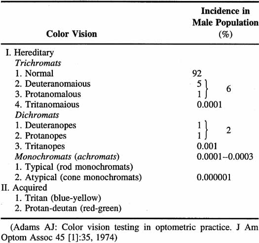 three, two, and only one primary, respectively, to match any color. COLOR BLINDNESS Rod monochromats are individuals totally without cones, or only a few scattered remnants. They represent less than 1 in 30,000 of the population and there are approximately equal numbers of males and females. Rod monochromats can match any color with any other color by simply adjusting the intensity of one of the colors The condition of blue cone monochromacy, in which an individual has rods and S cones but no L or M cones, is an even more rare X-linked stationary condition. Like rod monochromats, these patients have poor acuity, variable nystagmus, photophobia, but some residual color vision. The remaining color vision is based on a comparison of signals from rods and S cones.50,51 Distinguishing these patients from rod monochromats is useful because unlike the rod monochromats, for whom a deep red filter is extremely helpful for vision, the blue cone monochromats are helped more by a magenta filter that allows some blue as well as red light through it. Both types of monochromat have stationary vision throughout life and should be distinguished from patients with loss of all color vision from a progressive degenerative cone condition. COLOR DEFECTIVENESS Color-defective vision occurs in almost 10% of all males and almost 1% of females as a sex-linked recessive hereditary condition, explaining the higher prevalence of these hereditary red–green color defects in males. These so-called red–green defectives may be trichromatic, having two normal and one anomalous cone pigment, or dichromatic with only one of the normal two long wavelength cone pigments. For simplicity, we consider there to be a single M and a single L cone photopigment in the normal population. The anomalous or missing photopigment is either the L (protan defect) or M (deutan defect). A much rarer hereditary color-vision deficiency is presumed to involve the S photopigment (tritan defect). The prevalence of hereditary color-vision defects is shown in Table 2.